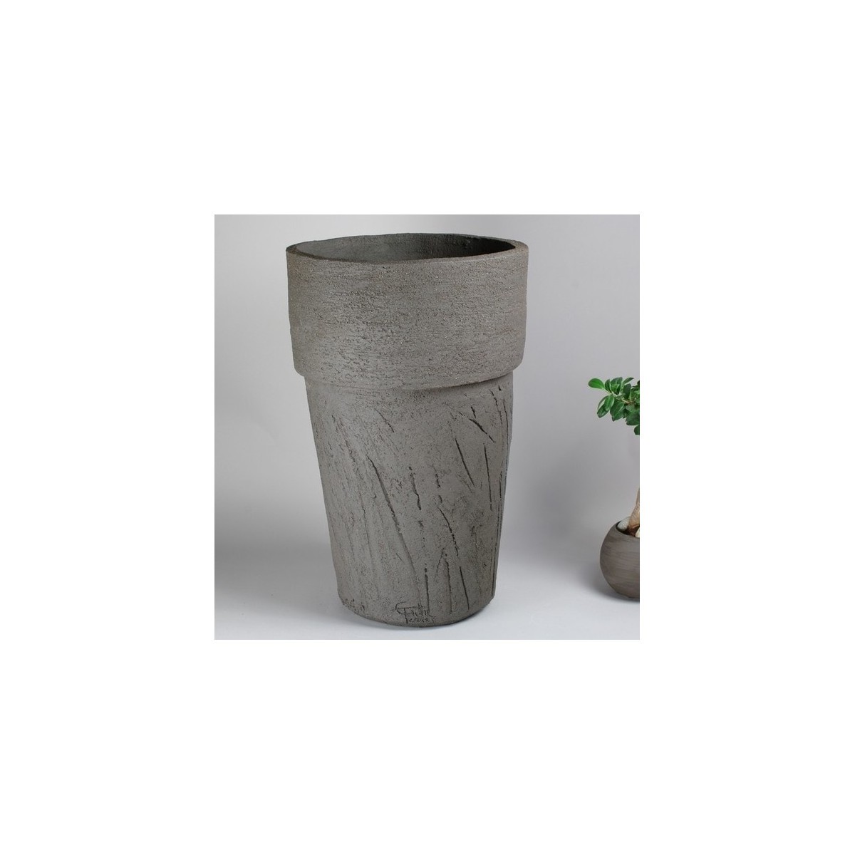 Conical garden pot in black stoneware, with a pleasant wide neck. floated and metallized stoneware during cooking. HT 60cm, diam 40cm.