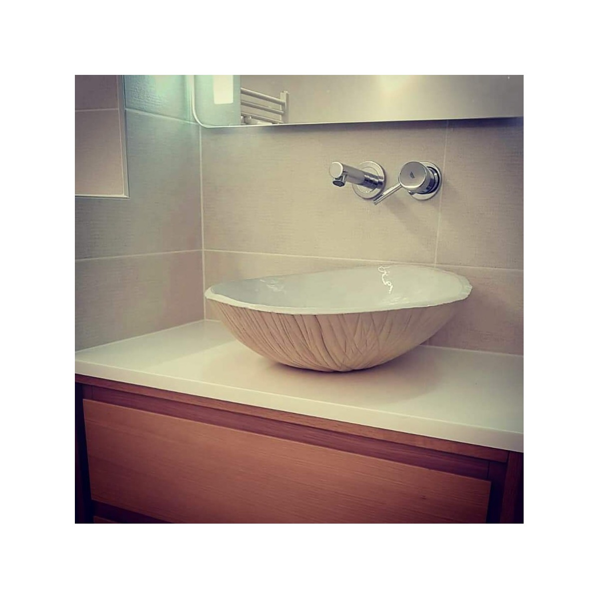 A single washbasin to be placed on a standard piece of furniture for a single bathroom.