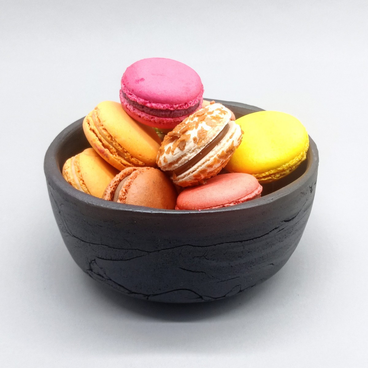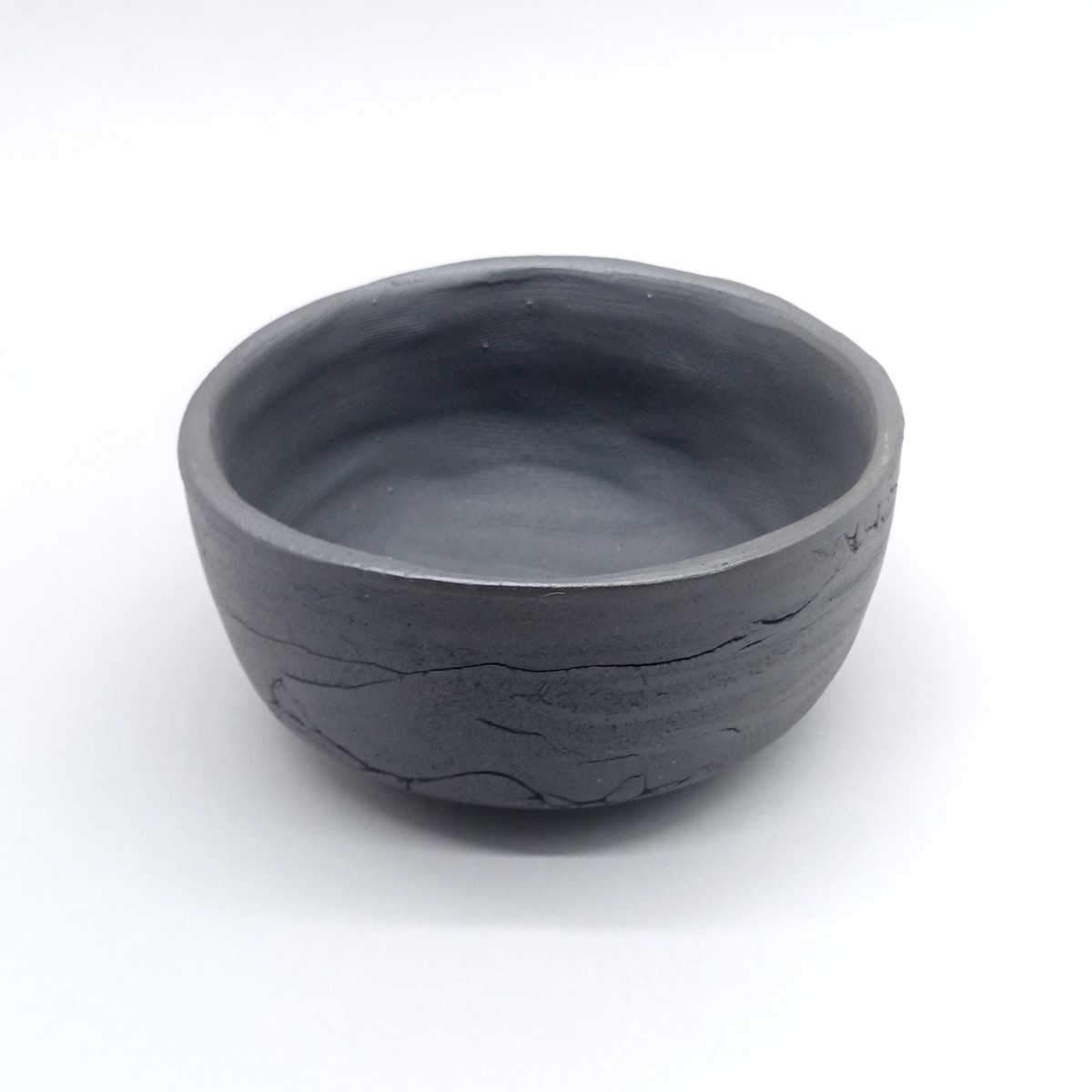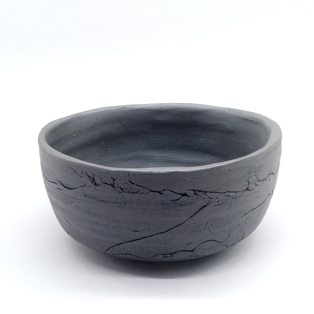 Black stoneware bowl, raw outdoors and indoors. For the presentation of pastry, in service for bread, or in garden center for compositions.