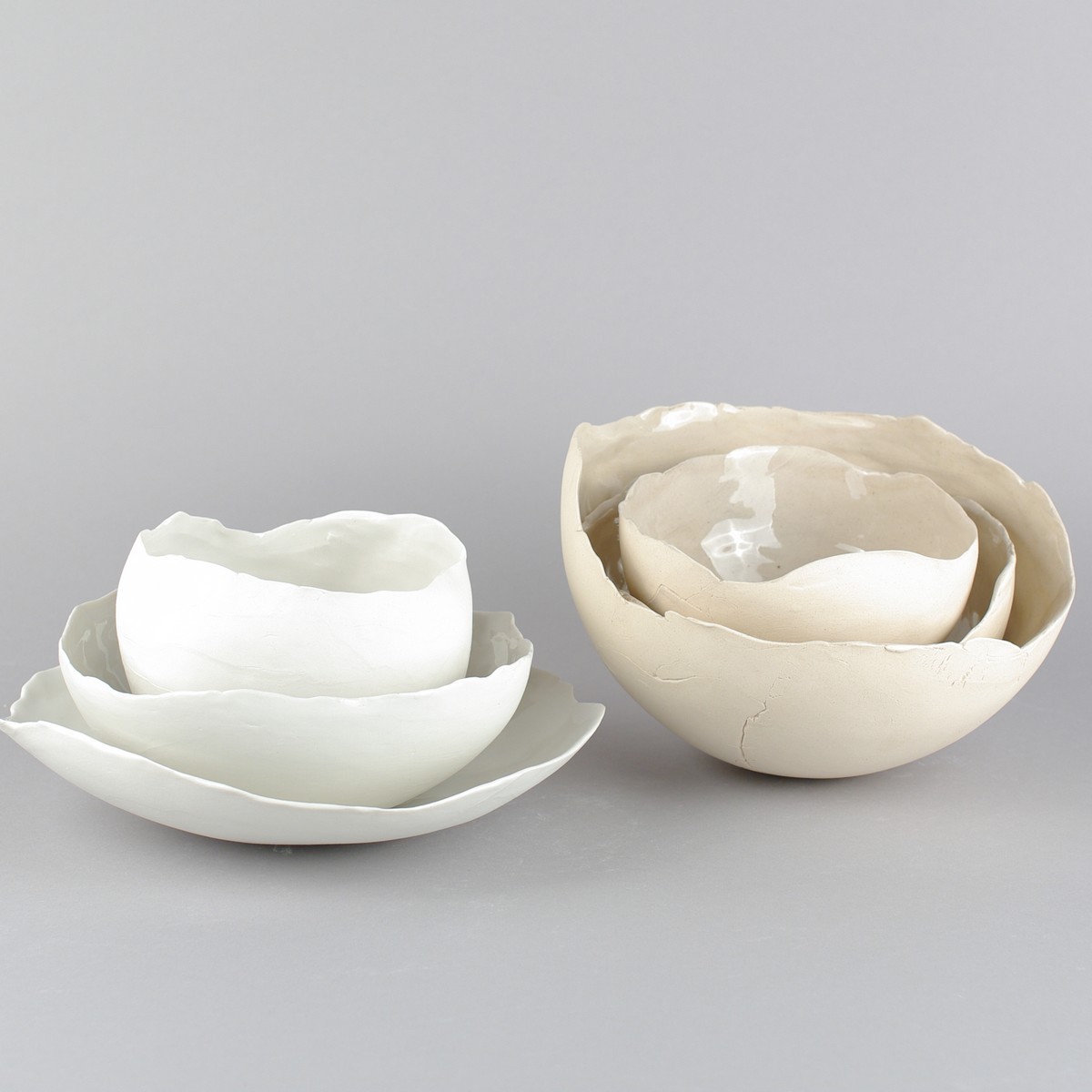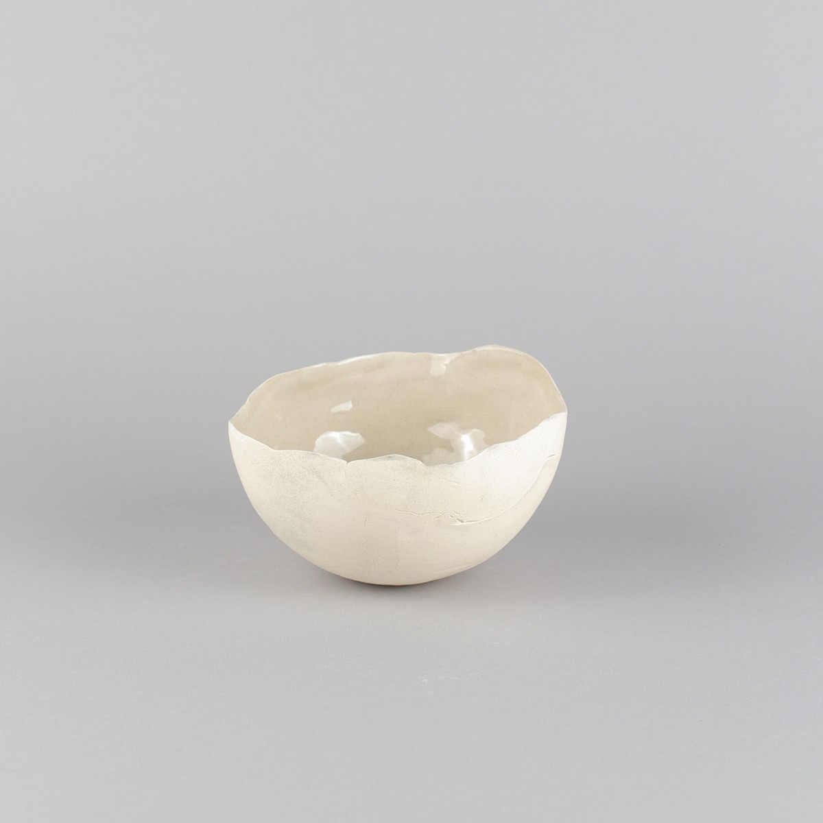 "Eggshell" bowl made in the palm of your hand. The stoneware is eggshell white. It is rough on the outside and it has a shiny glaze finish inside. The rims are fine and have a rough cut finition.
