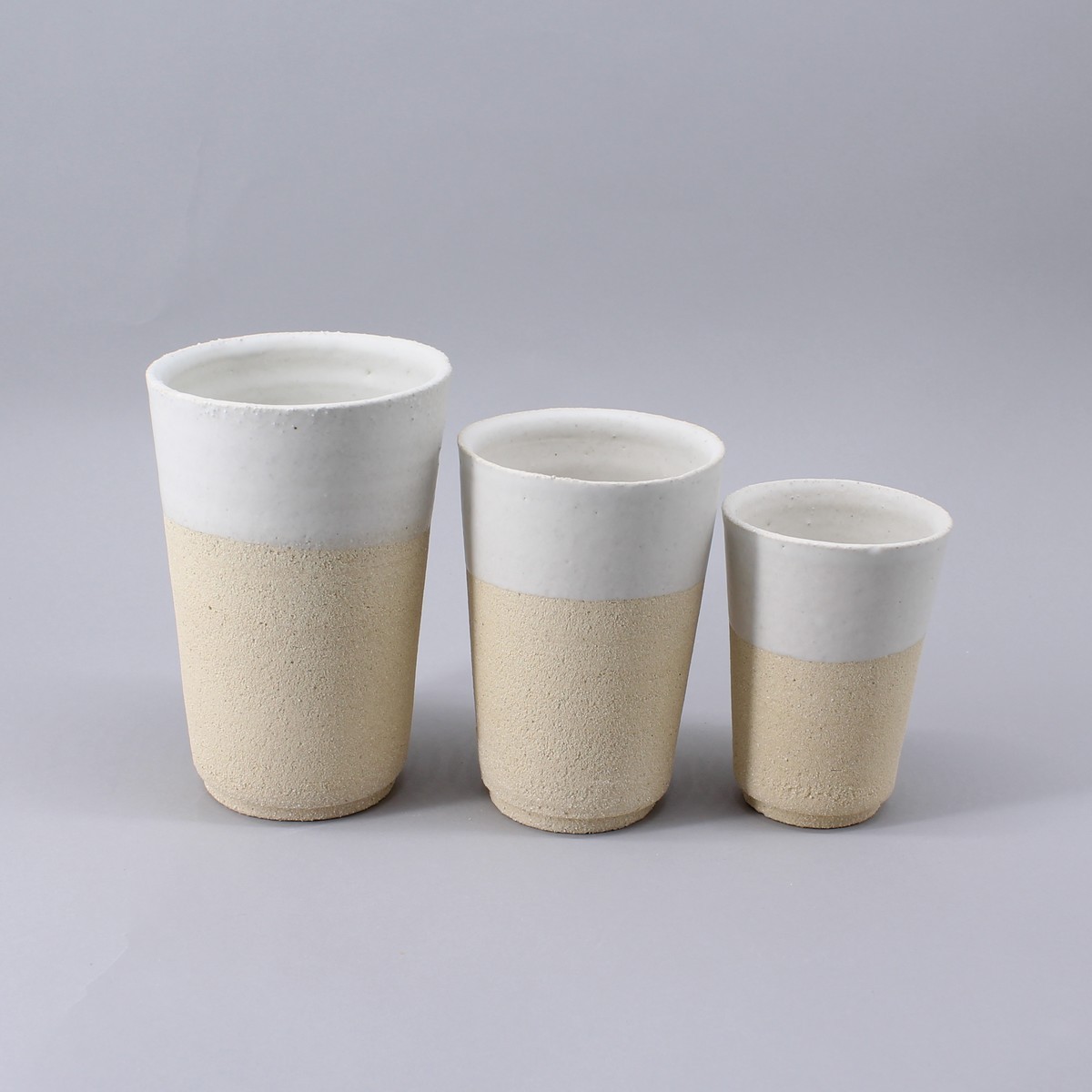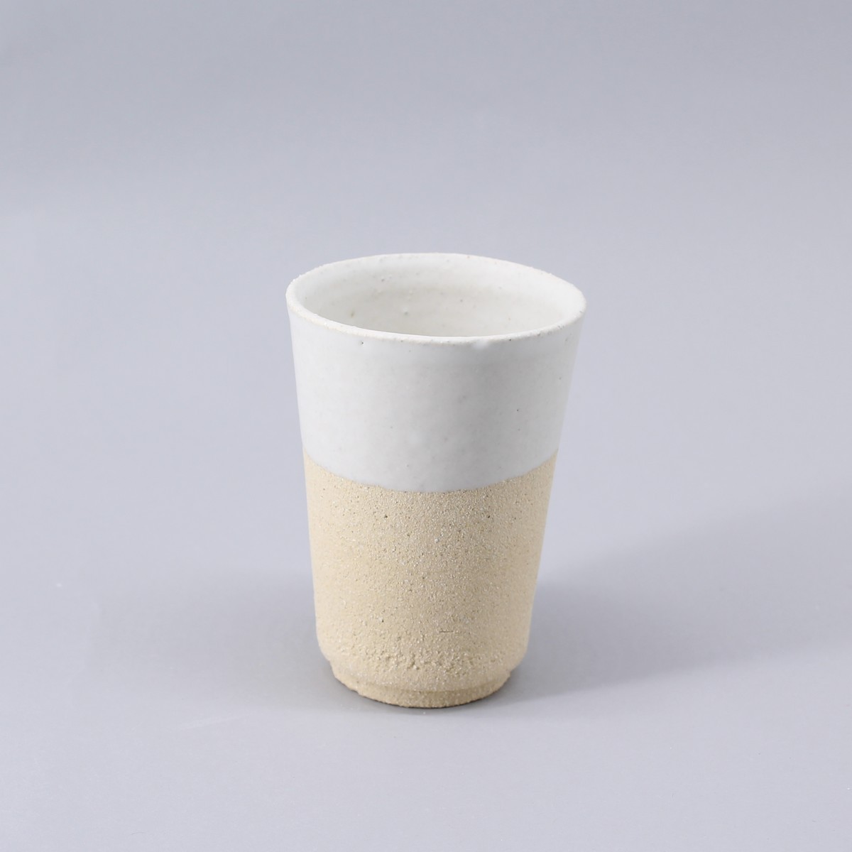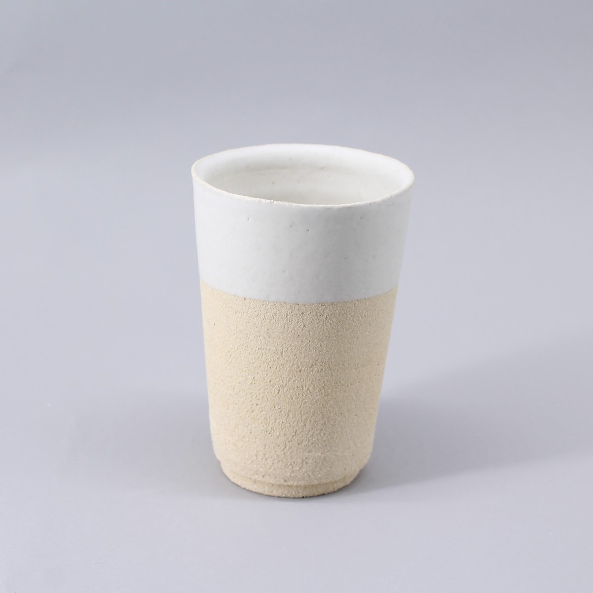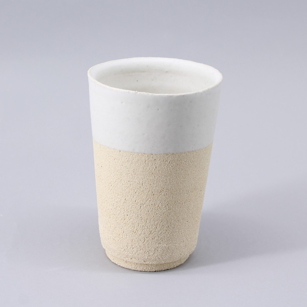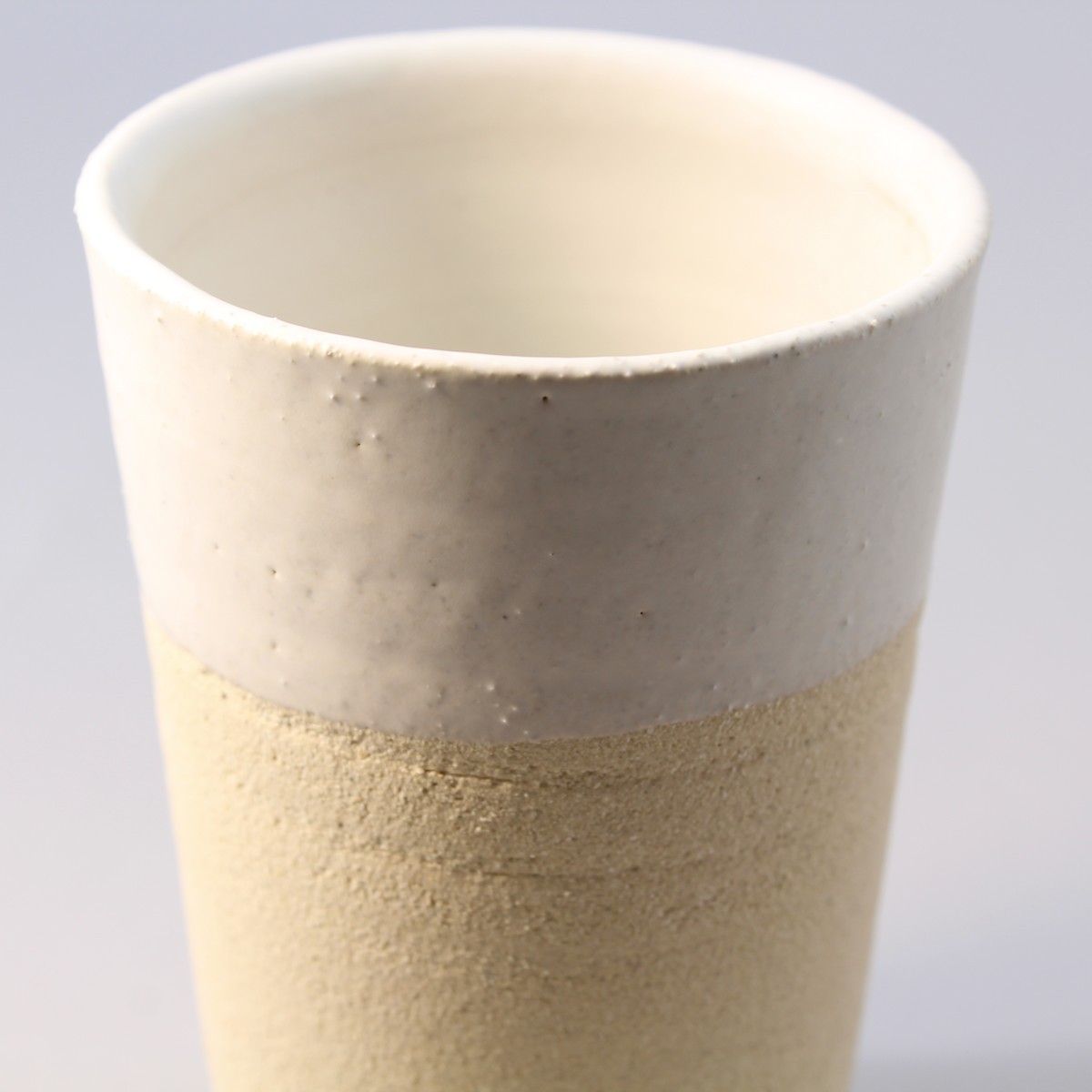 The fine grain exterior on the bottom part contrasts with the smooth white glaze on the top part.