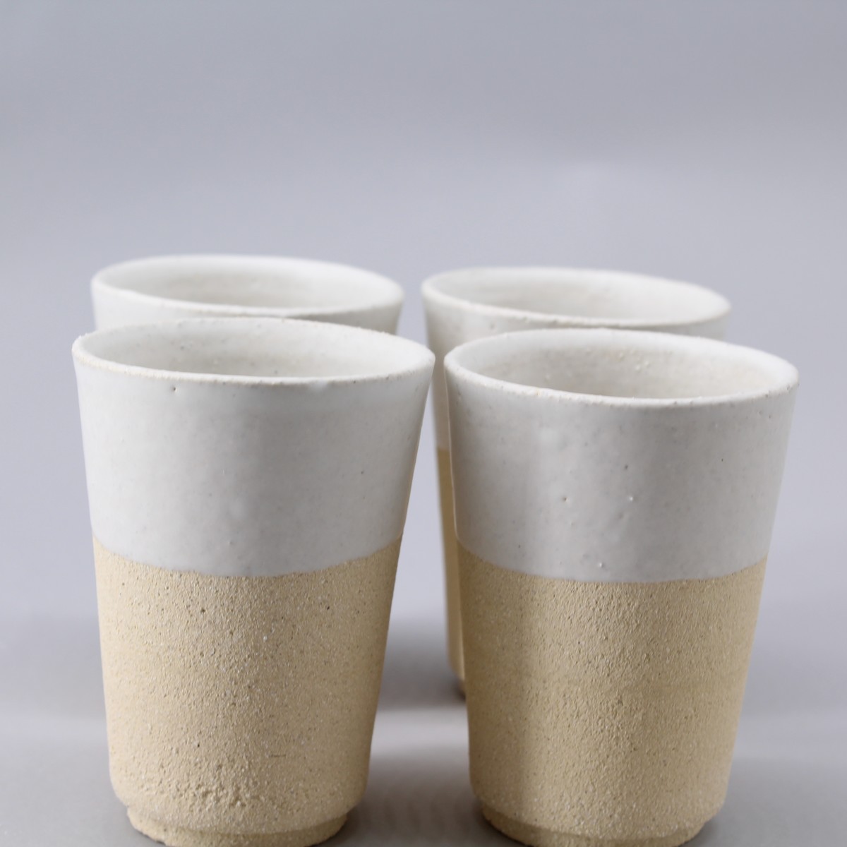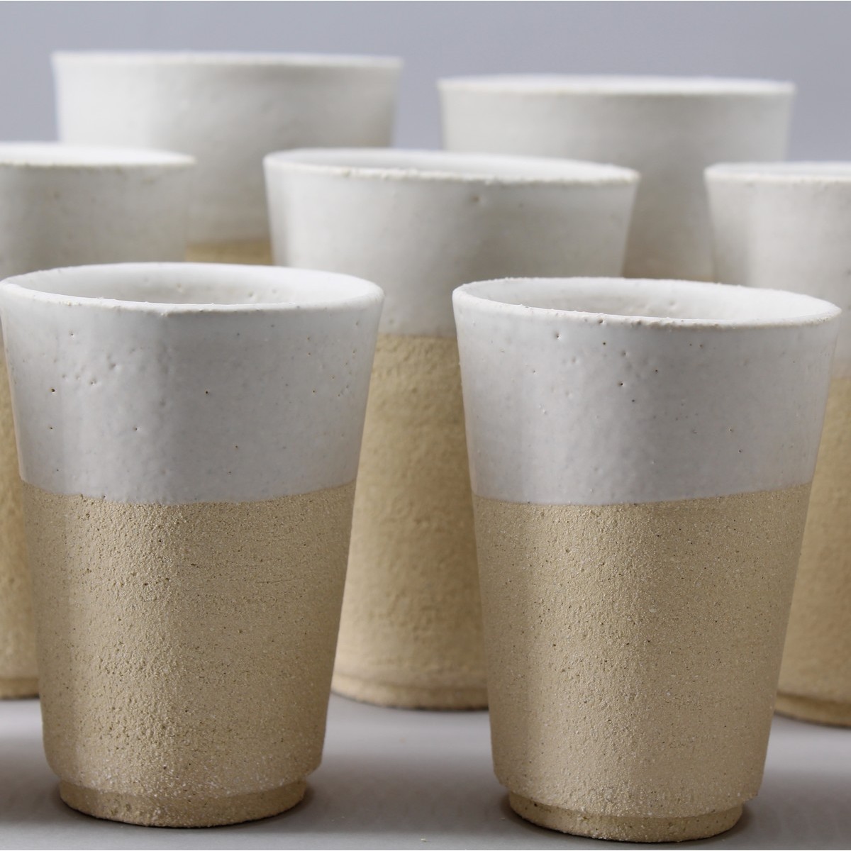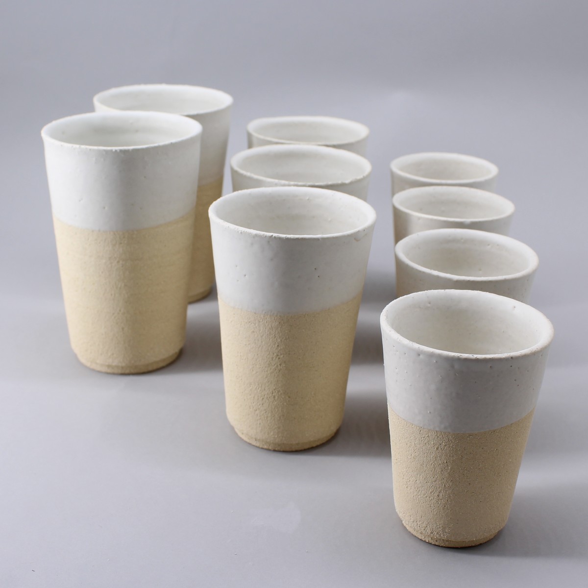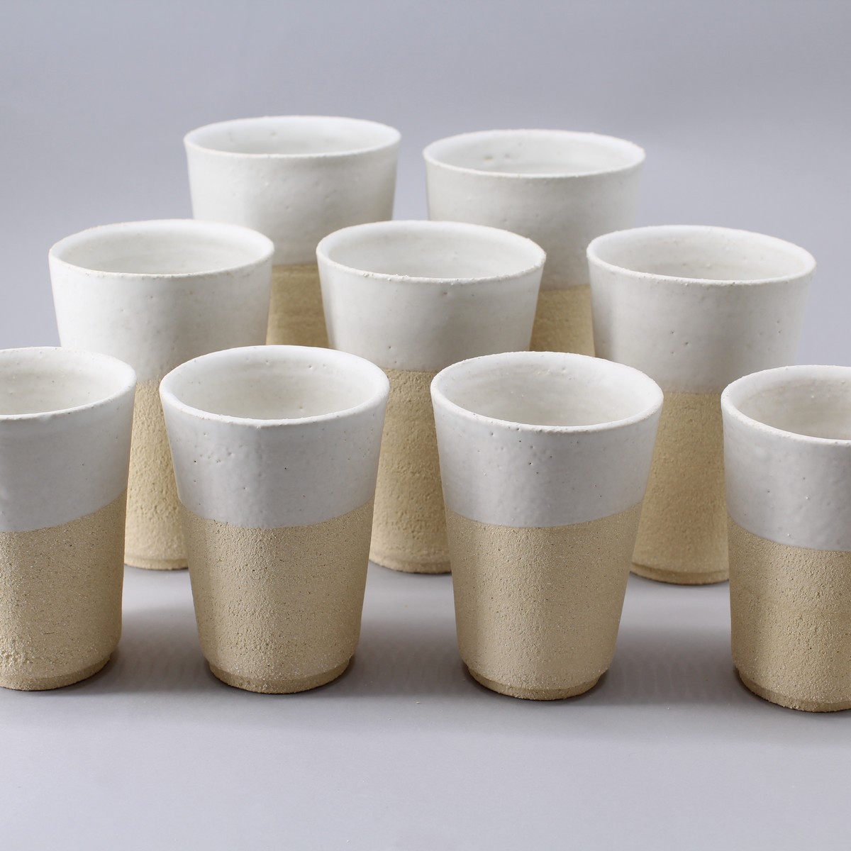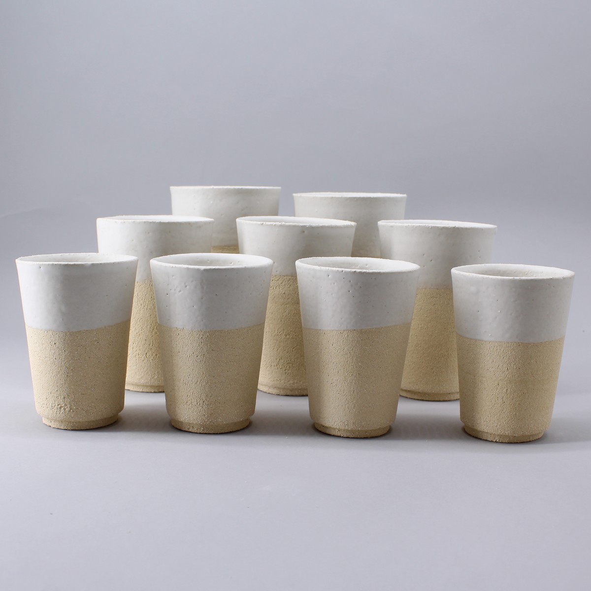 The fine grain exterior on the bottom part contrasts with the smooth white glaze on the top part.