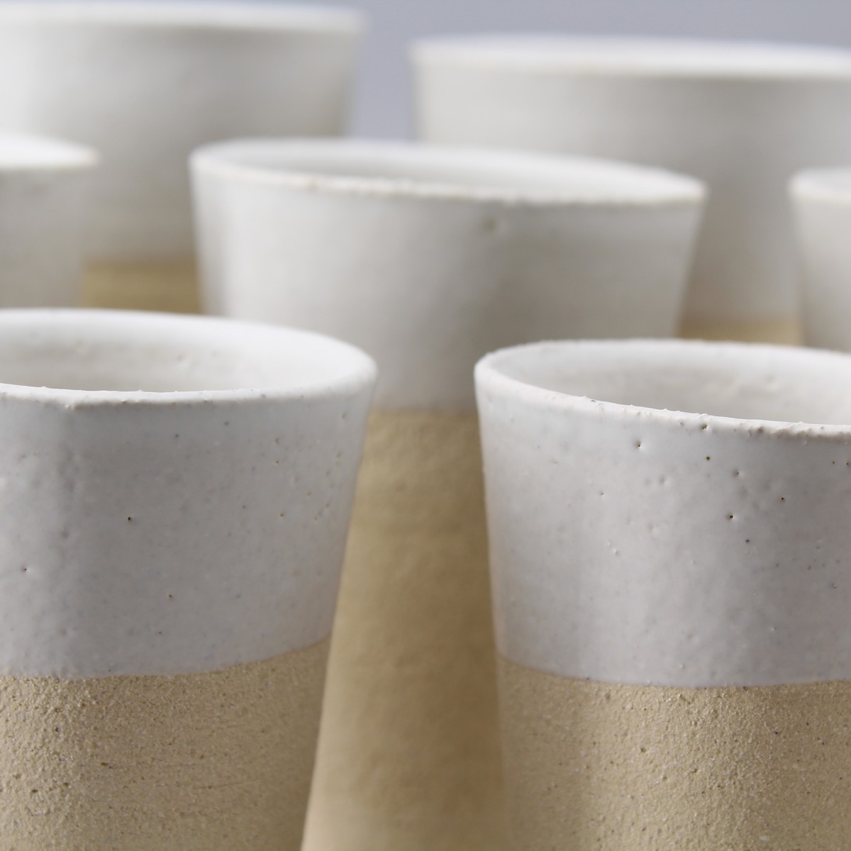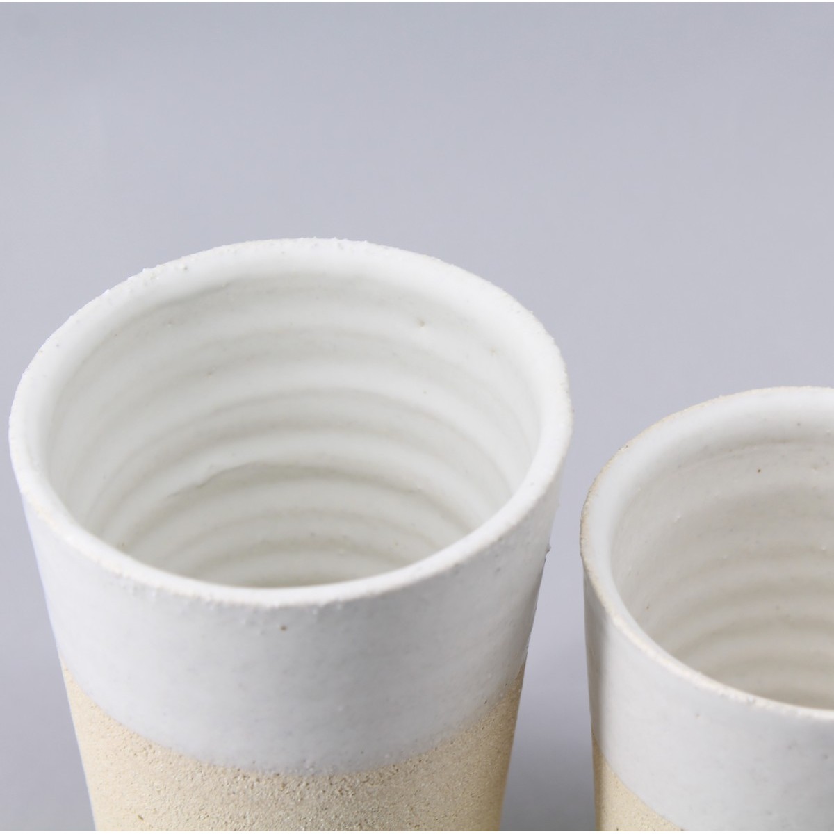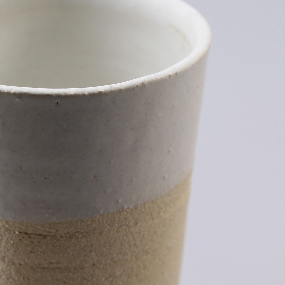 The fine grain exterior on the bottom part contrasts with the smooth white glaze on the top part.