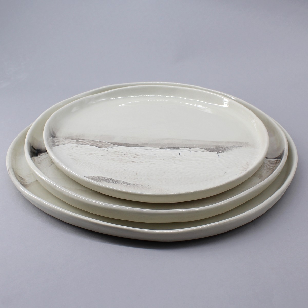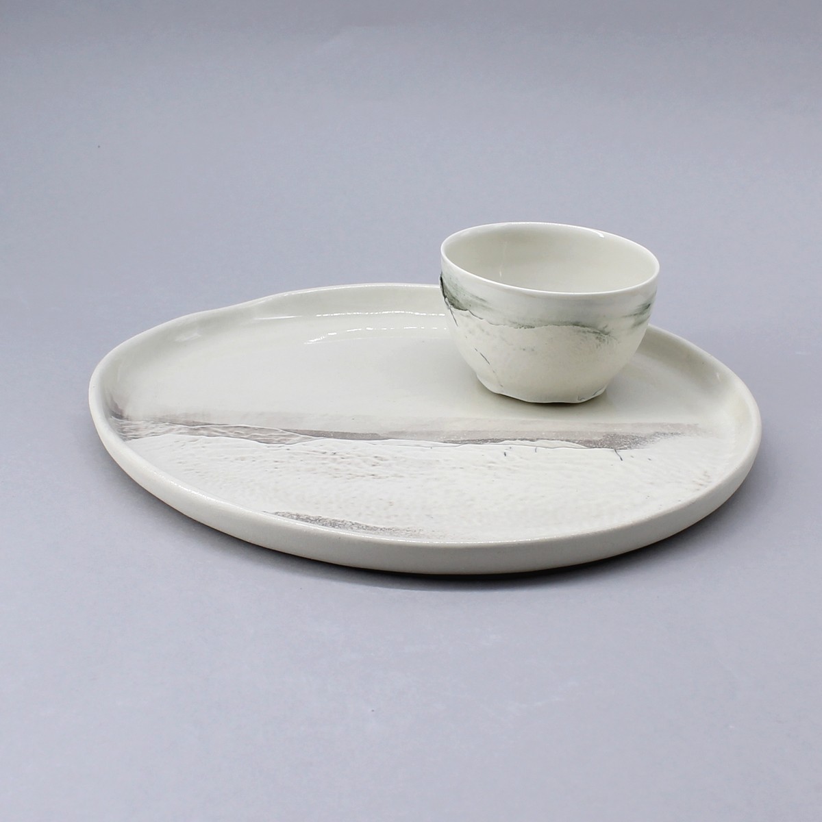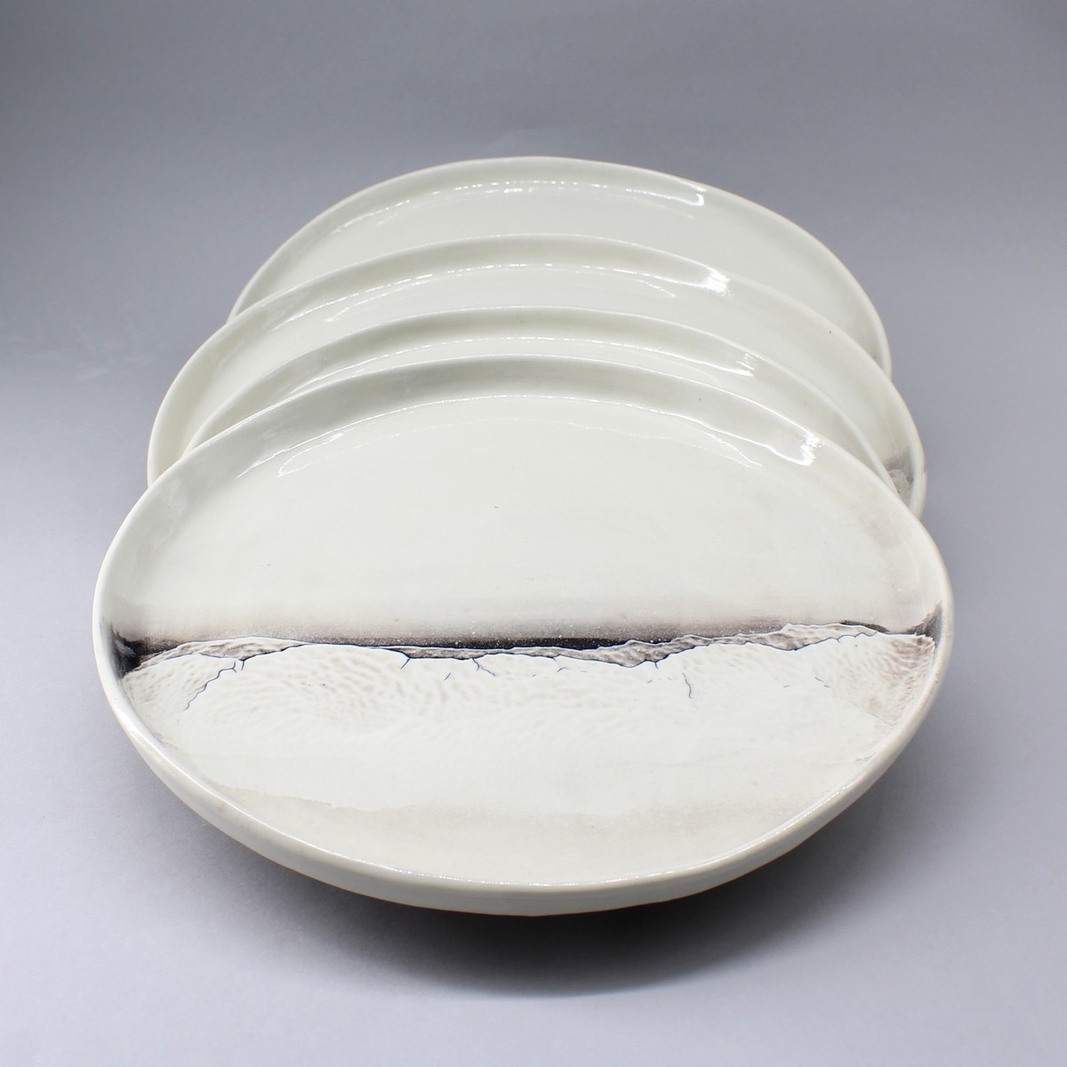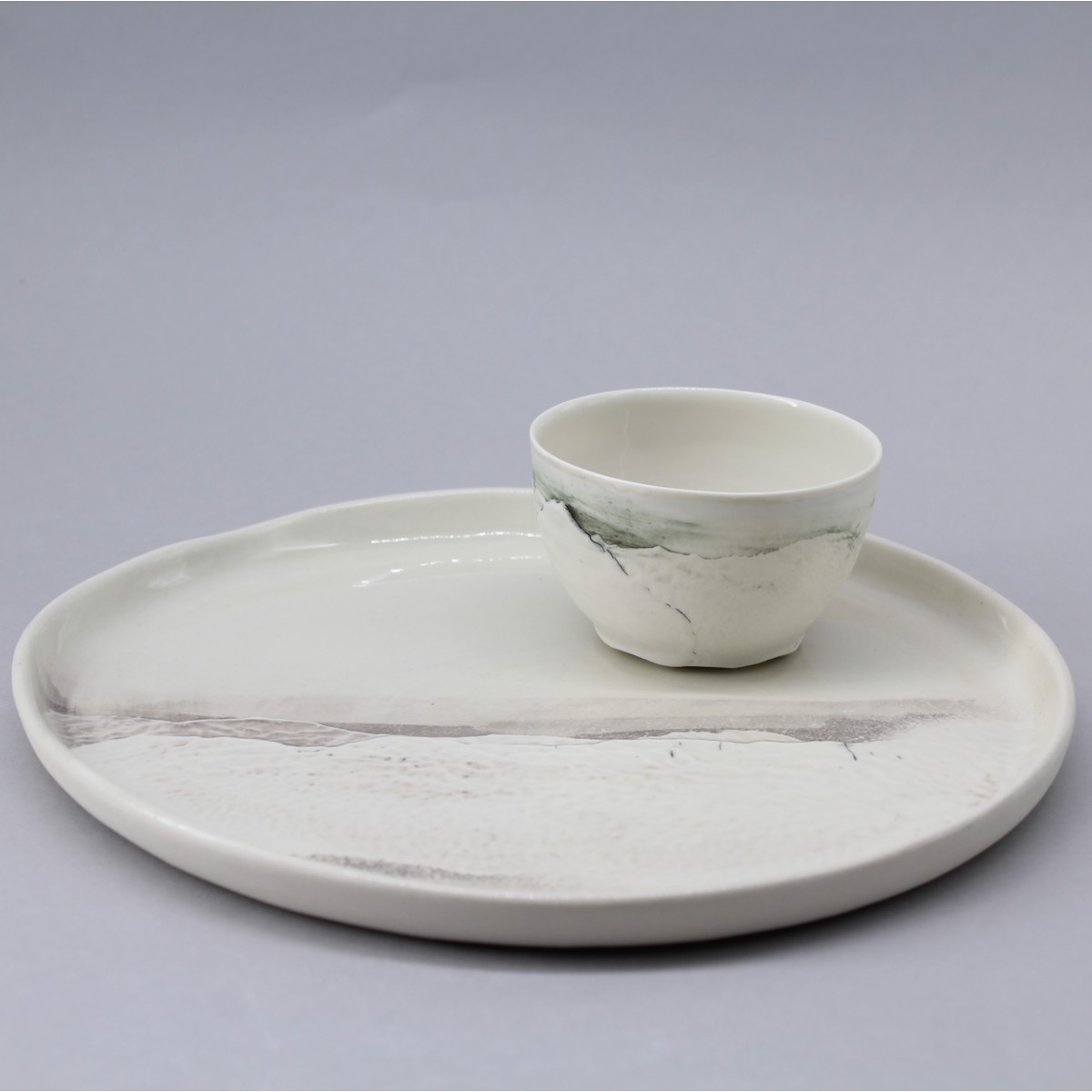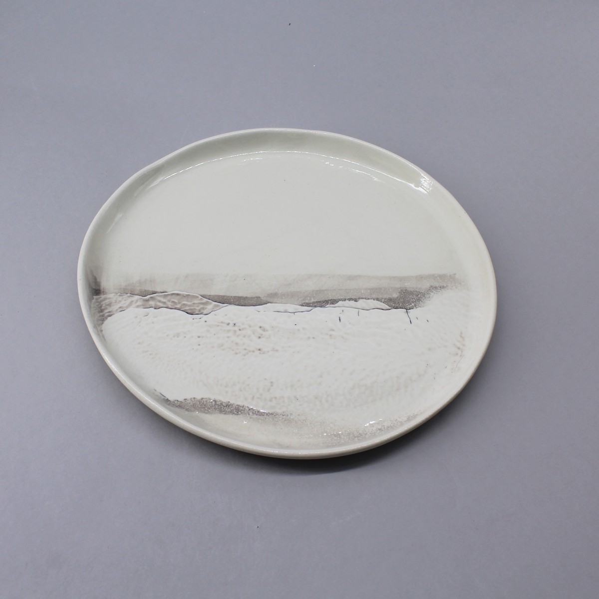 Handmade porcelain dinner plate with 1 m rim. Contemporary shape decorated in 1/3 with relief from the "Aléasucs" collection, each piece is
