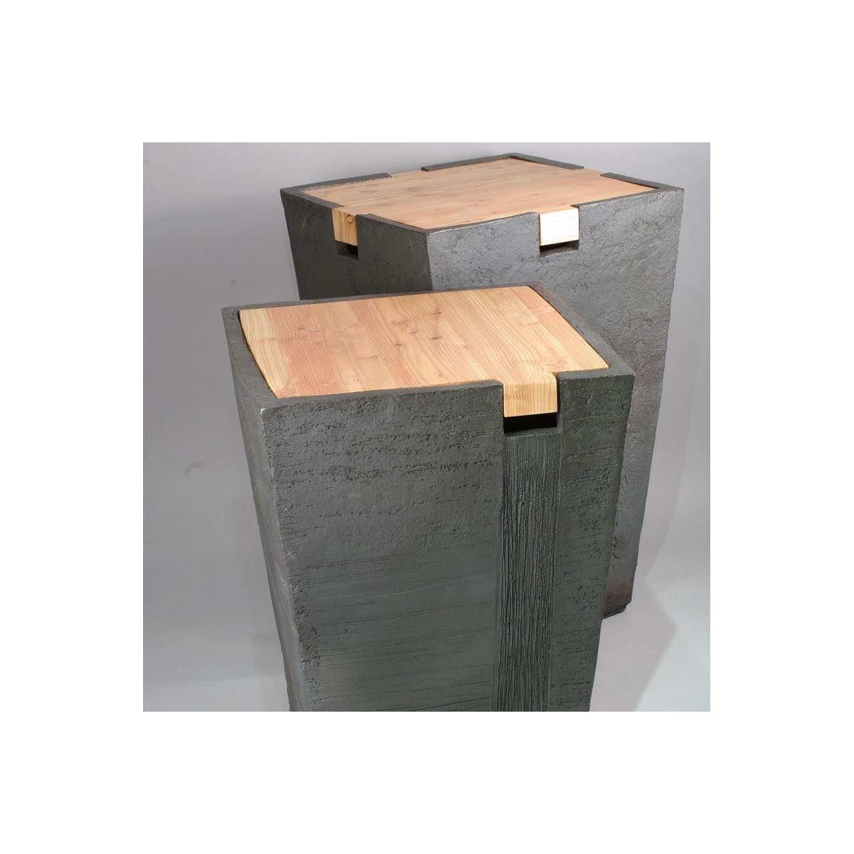 Stoneware and wood, these coffee tables open to provide storage space. Various sizes or made to measure. They consist of a foot in black-colored chamotte earth, the printing of materials or surface engravings. A recess allows to fix a stable seat in treated wood without toxic product for inside or outside, they are guaranteed not frost-resistant. Worked at high temperature, the sandstone is no longer frost-resistant and is guaranteed to last.
