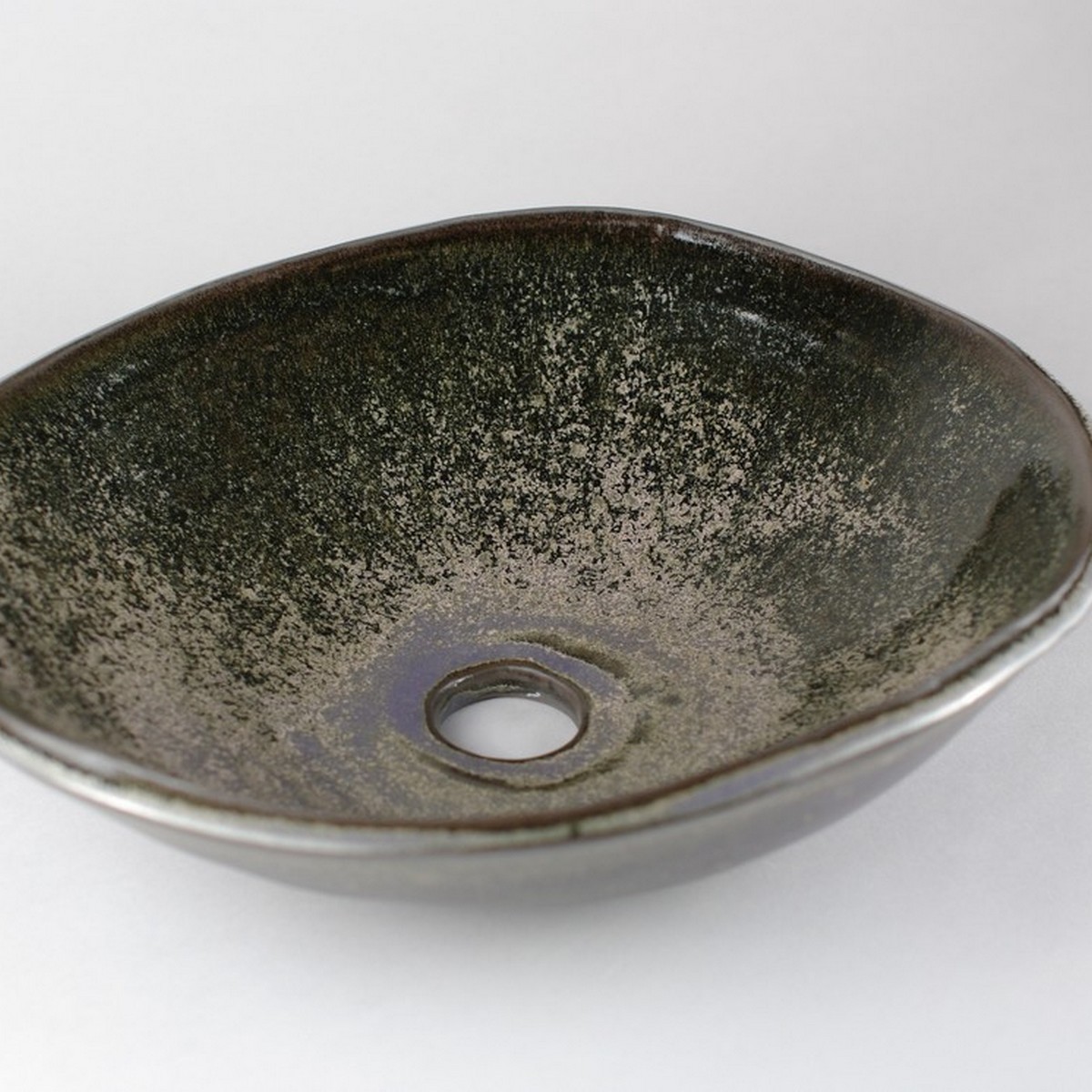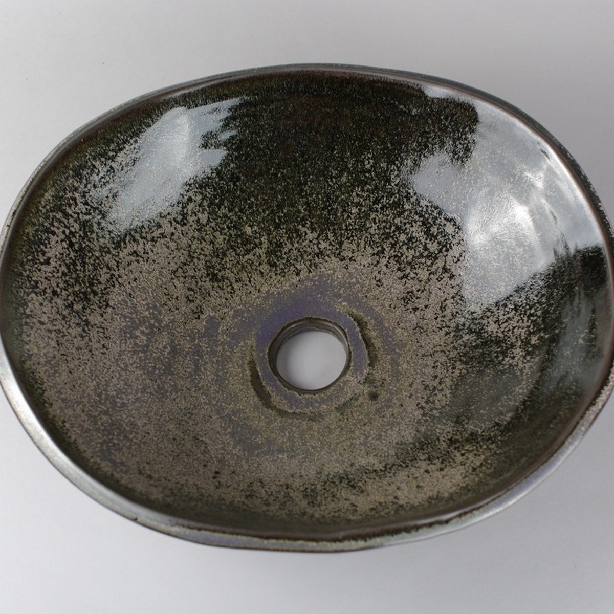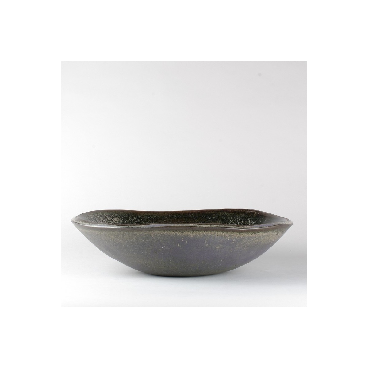 This bathroomsink in black stoneware is enamelled with a unique original enamel creating nucleations of random purple color. Slightly ovalized, it is 10cm high, 37cm long, 33cm wide.