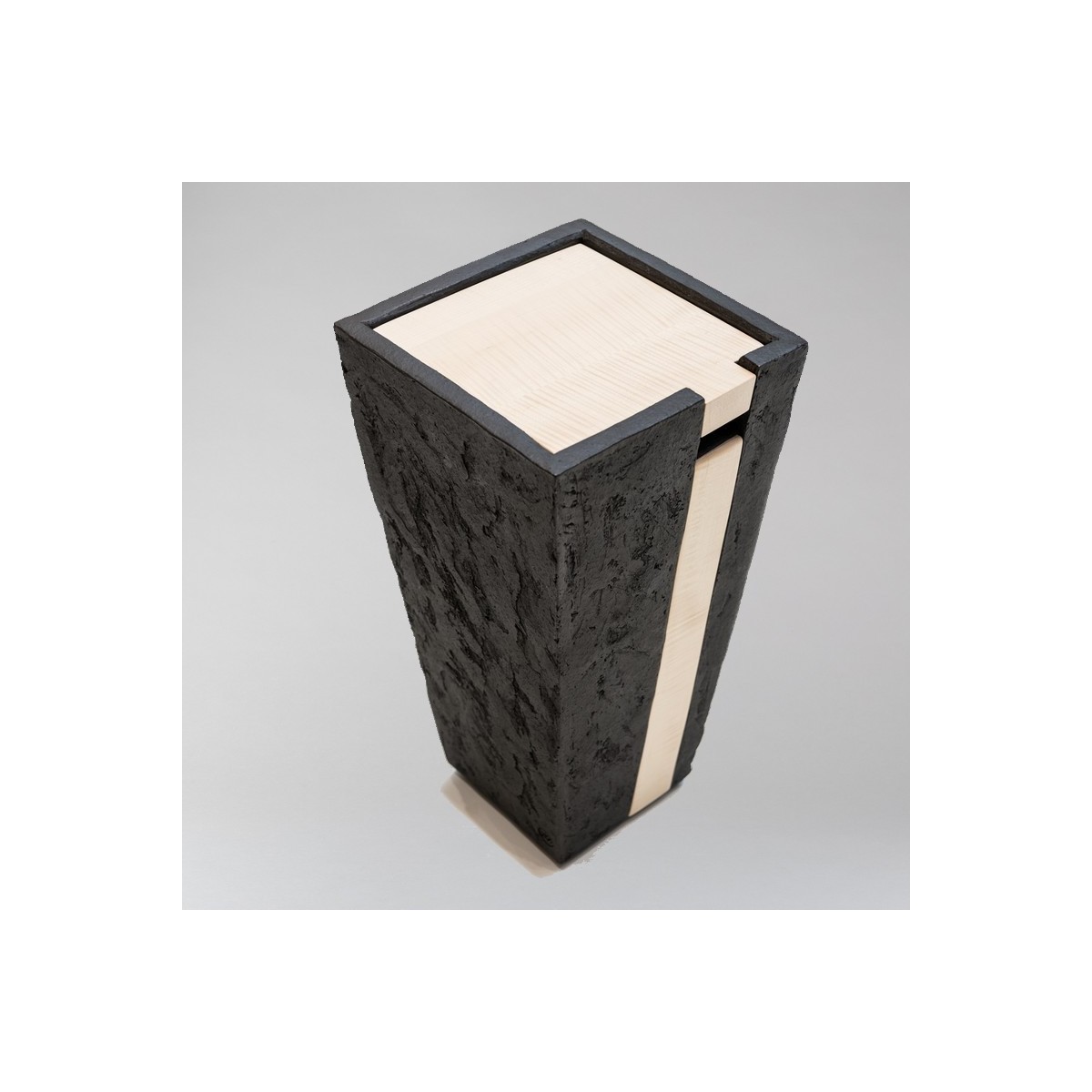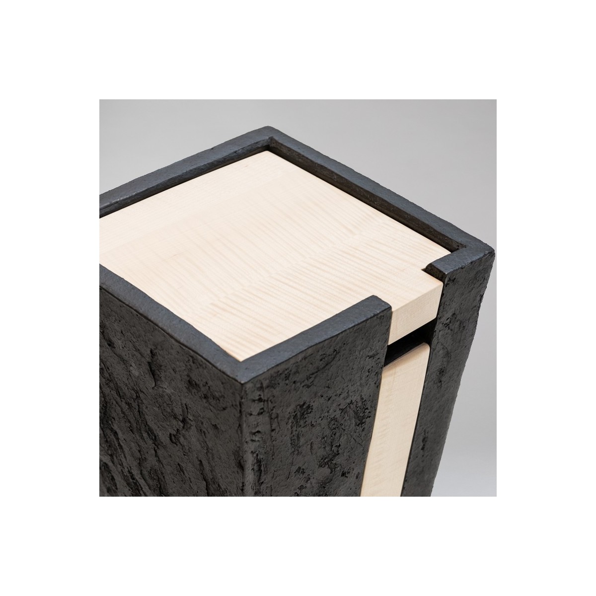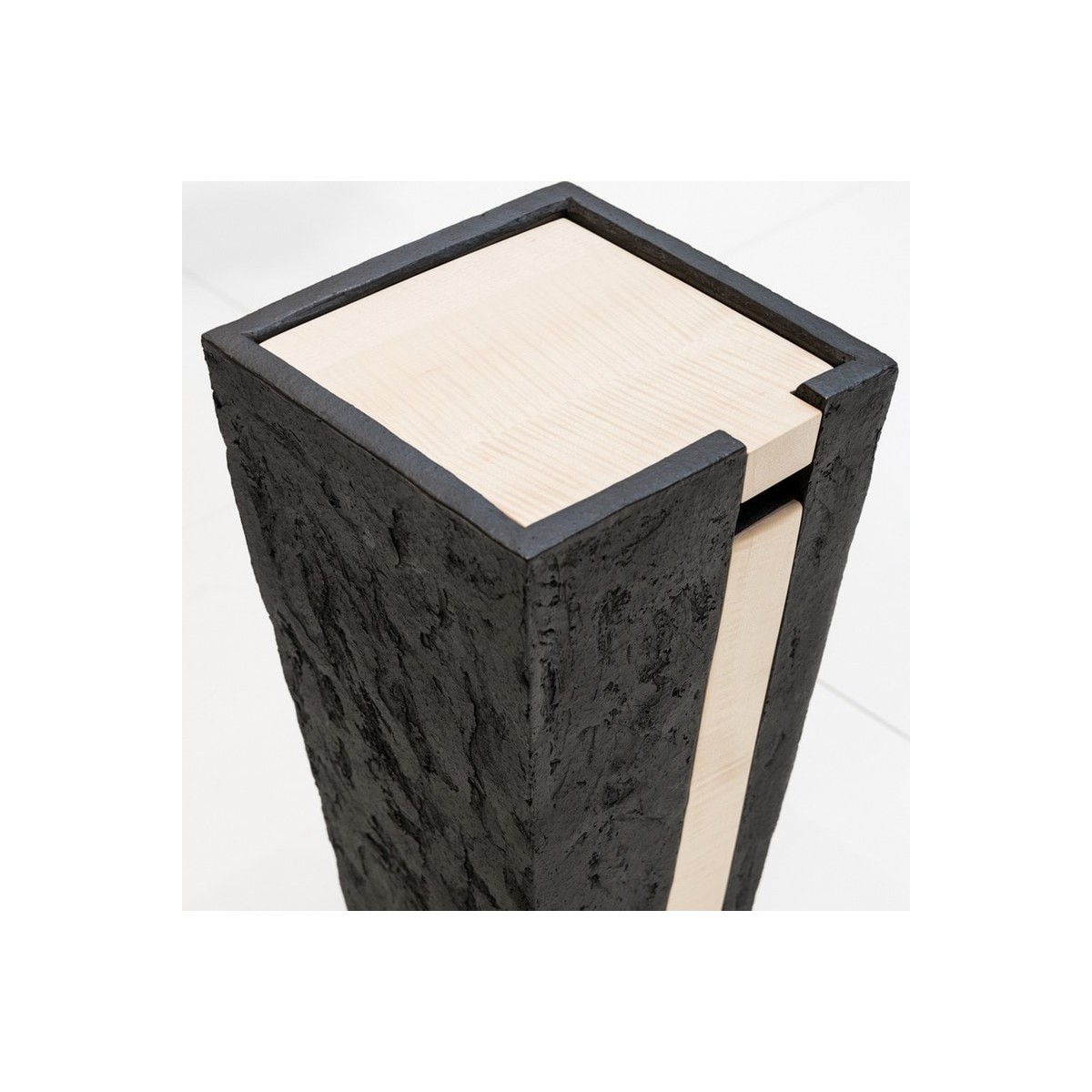 In black sandstone cooked at very high temperature and in wavy maple wood. It can be used as a seat, additional stool.