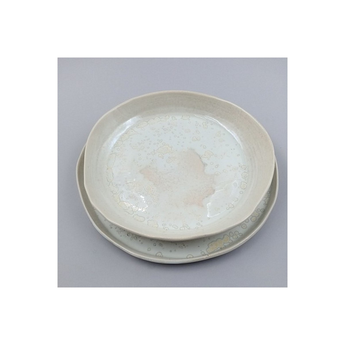 Soup bowl, round, deformed by hand, rough exterior in relief, enameled interior with frost crystal effect.