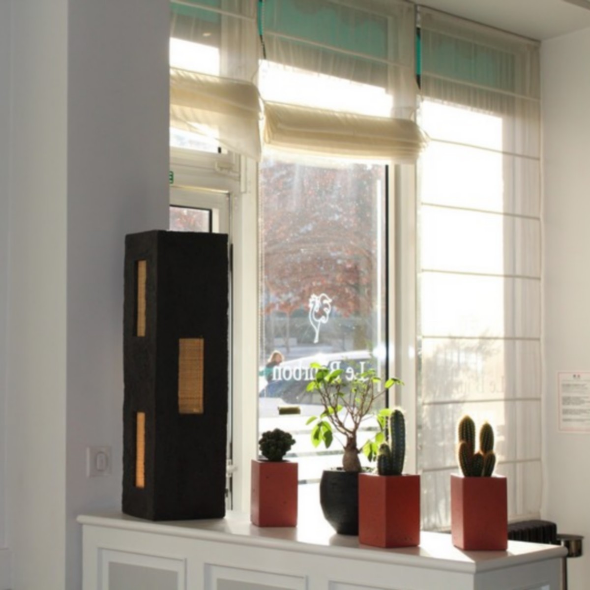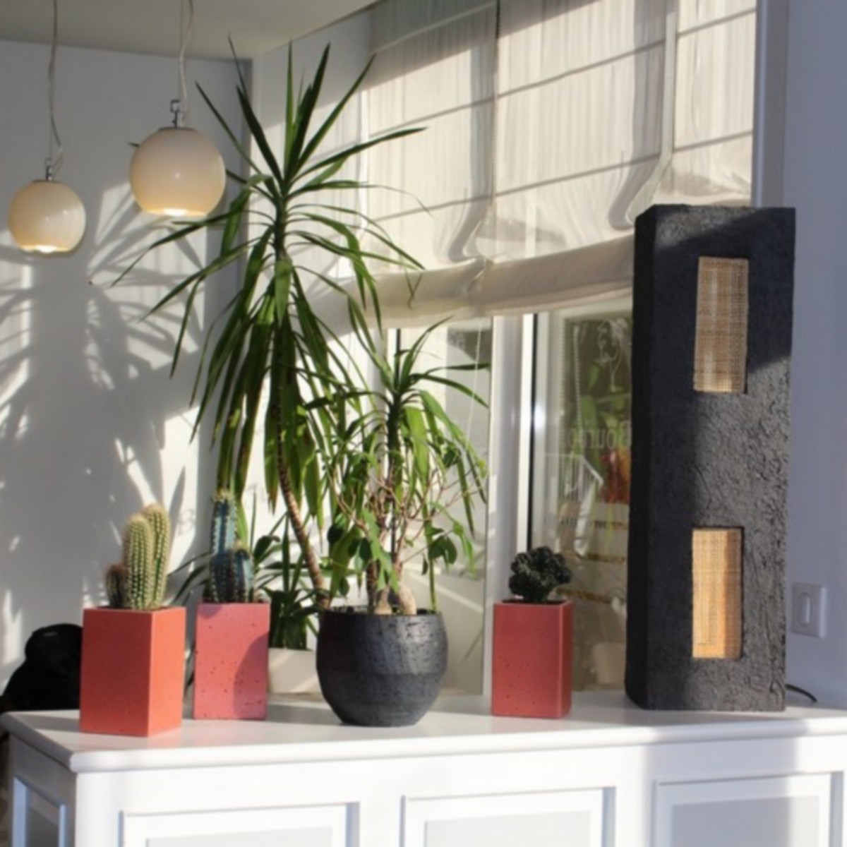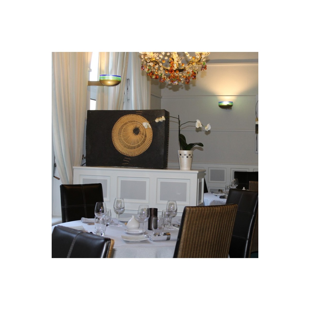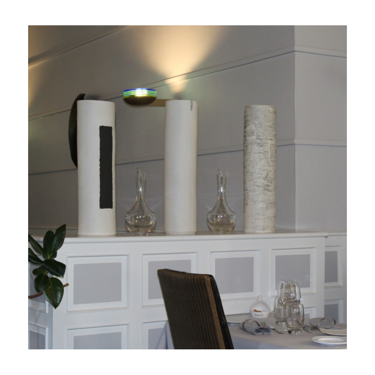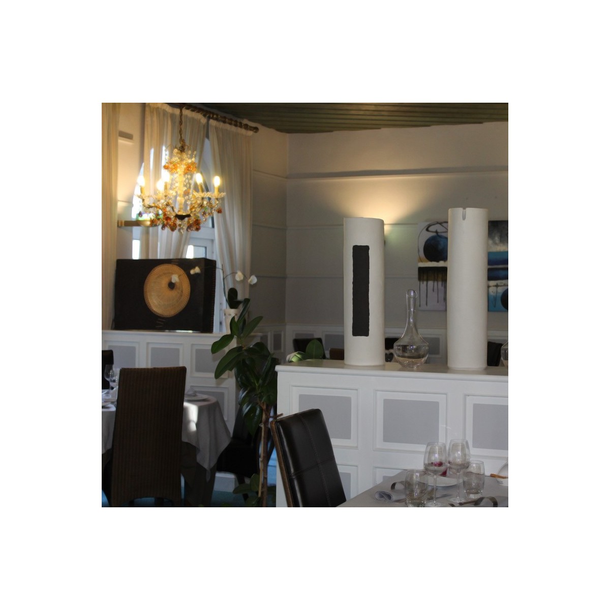 Décoration luminaires et vases dans cette salle de l’Hôtel restaurant "Le bourbon". Lampe grès noir et cannage. Grands vases porcelaine. Créer des espaces séparés grâce à une décoration sur-mesure. Des matériaux brut assortie à la vaisselle ( créée aussi sur-mesure) et au mobilier. Une harmonie de pièces uniques.