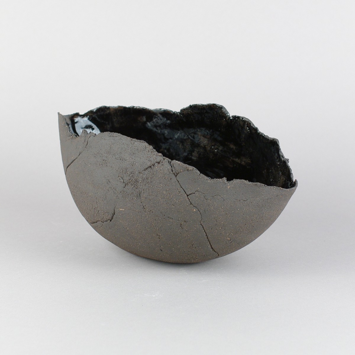 Saladier en forme de coque, grès noir brut en extérieur et émaillé noir avec des reflets métallique en intérieur.