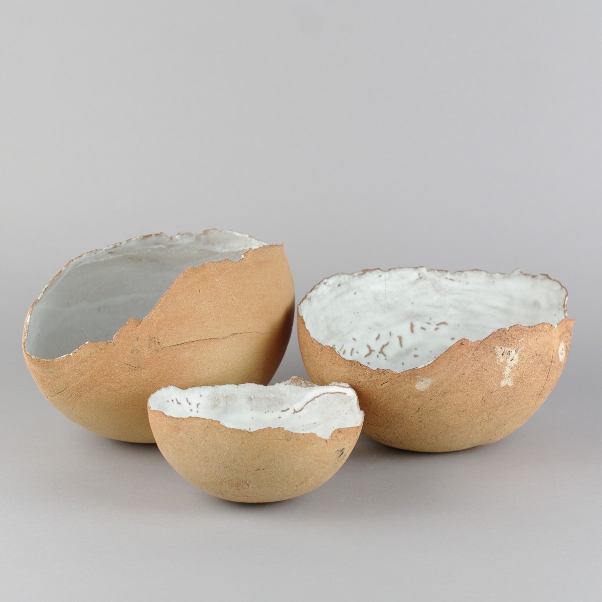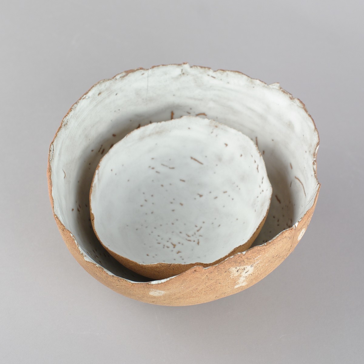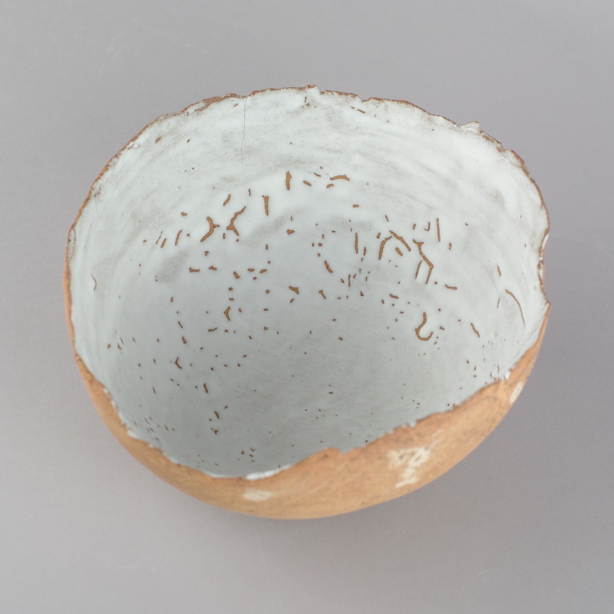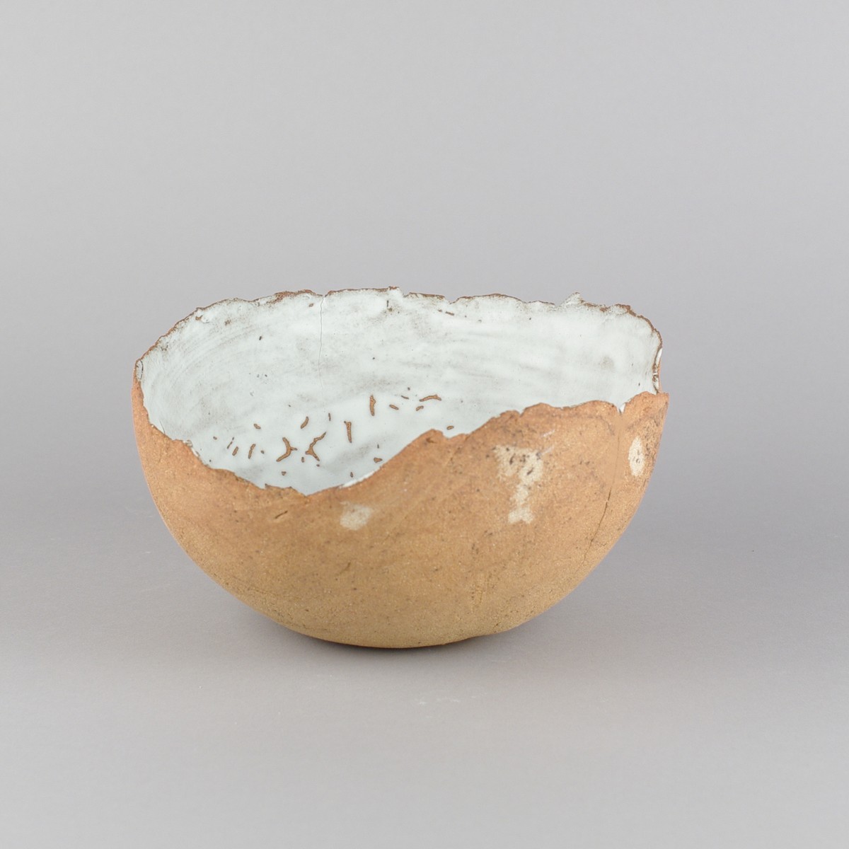 Saladier en forme de coque, grès brut en extérieur et émaillé blanc mat avec des rétractations en intérieur. Les rétractations sont purement esthétiques, elles n'altèrent en rien la résistance des pièces.