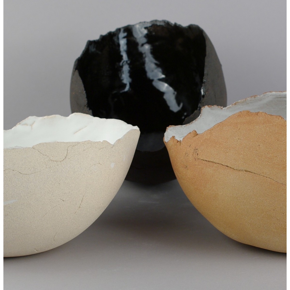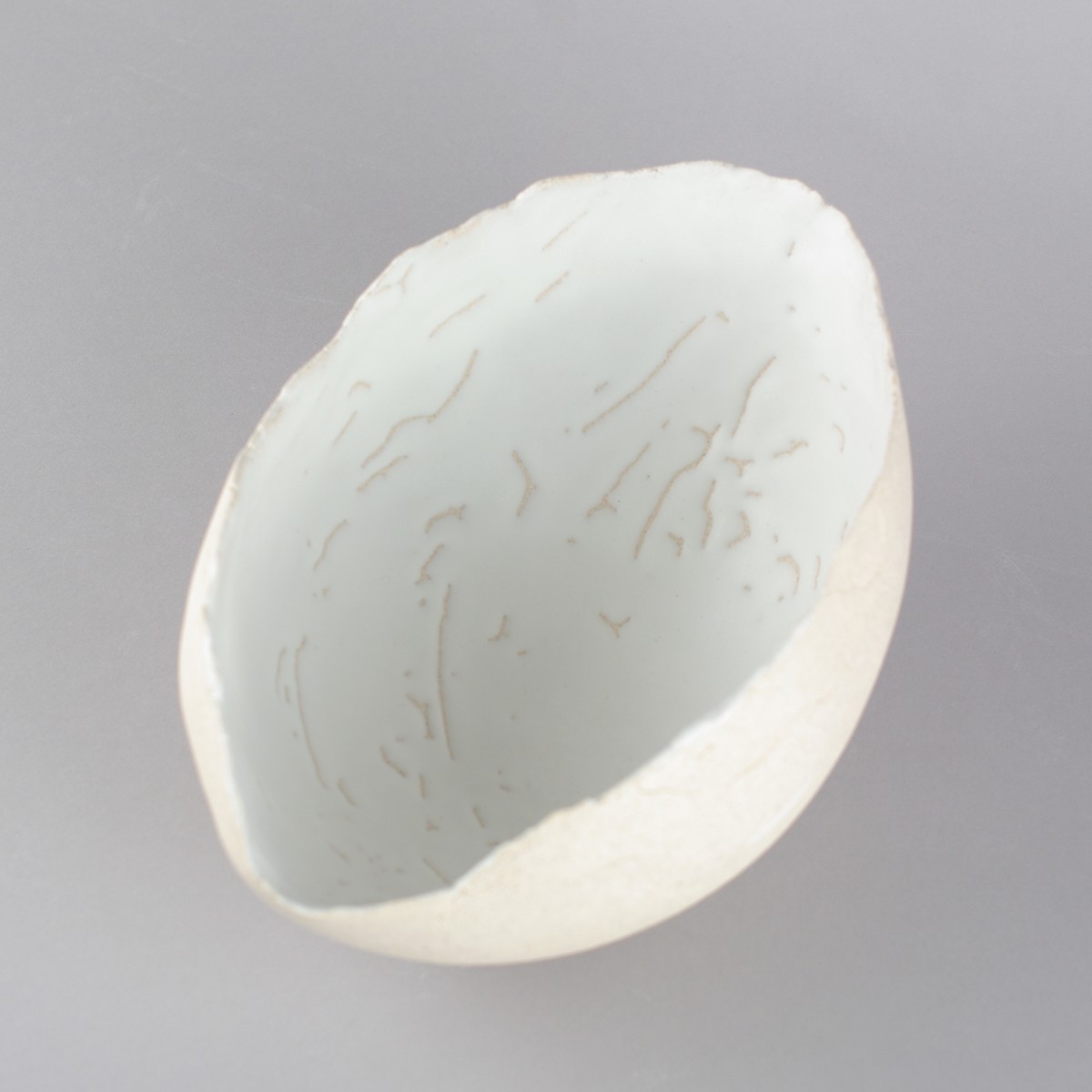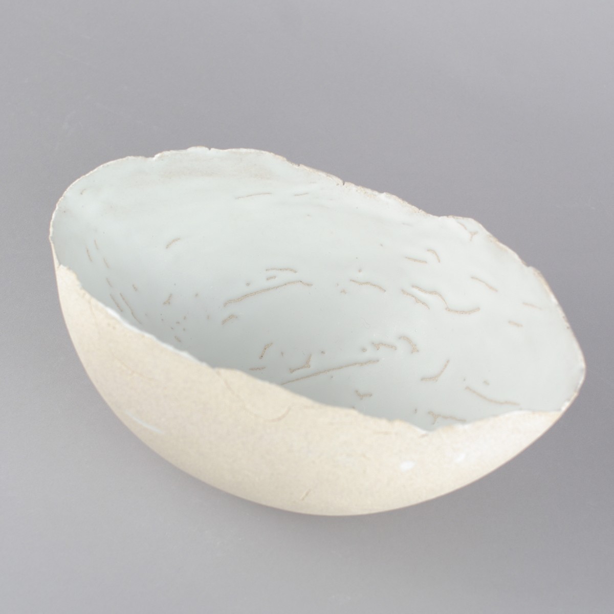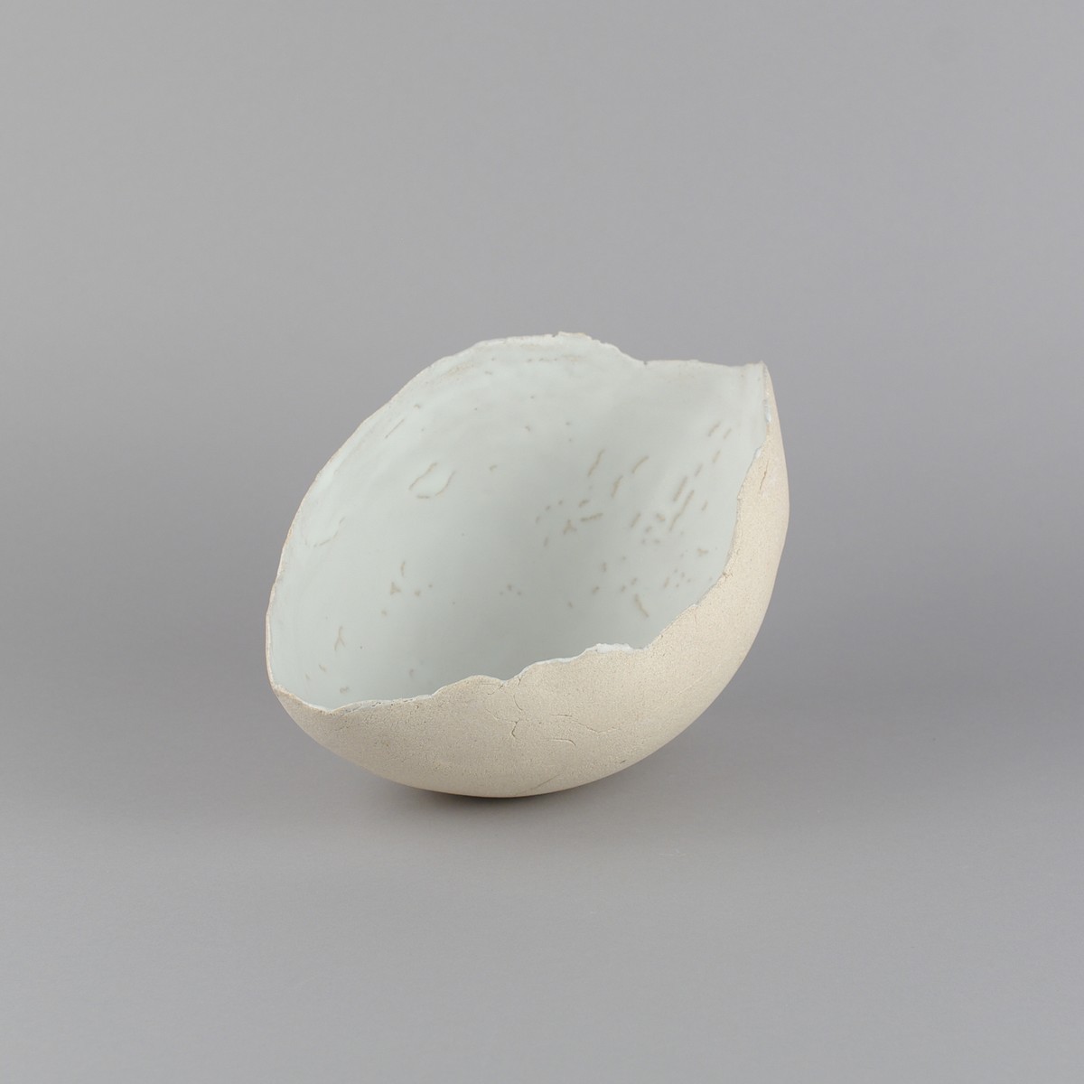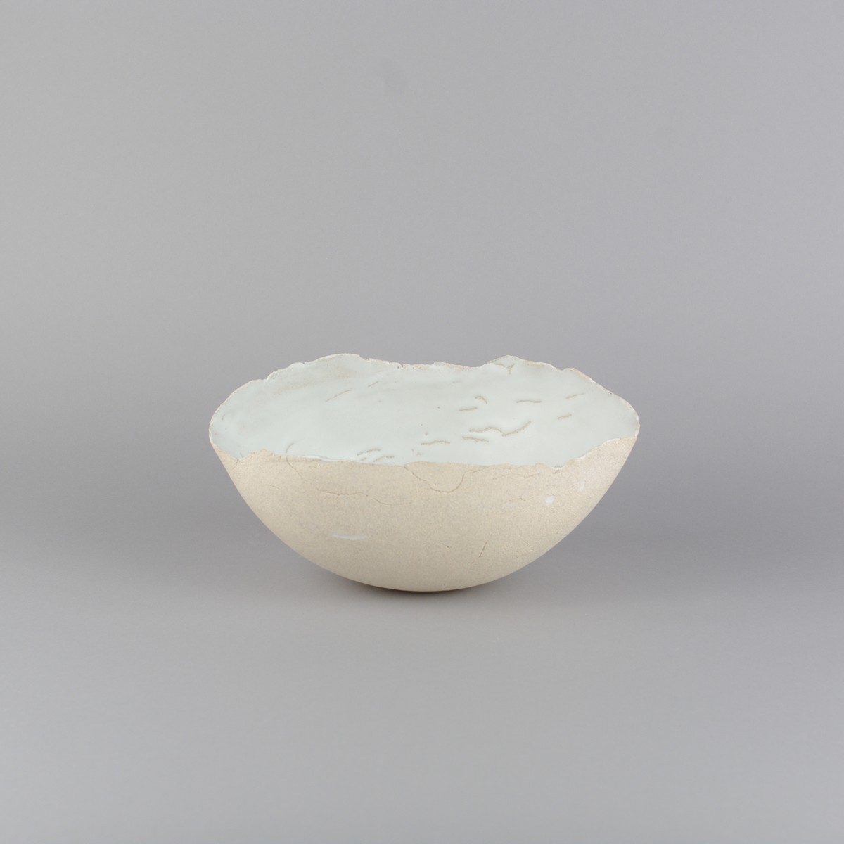 Saladier en forme de coque, grès blanc brut en extérieur et émaillé blanc mat avec des rétractations en intérieur. Les rétractations sont purement esthétiques, elles n'altèrent en rien la résistance des pièces.