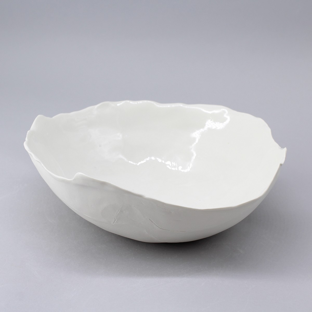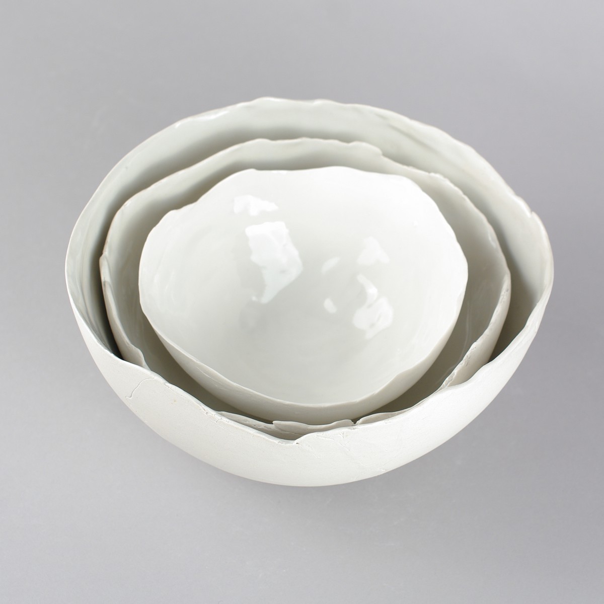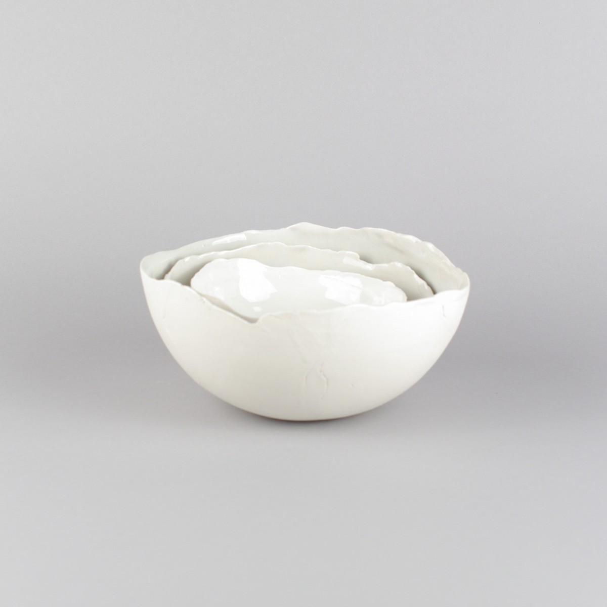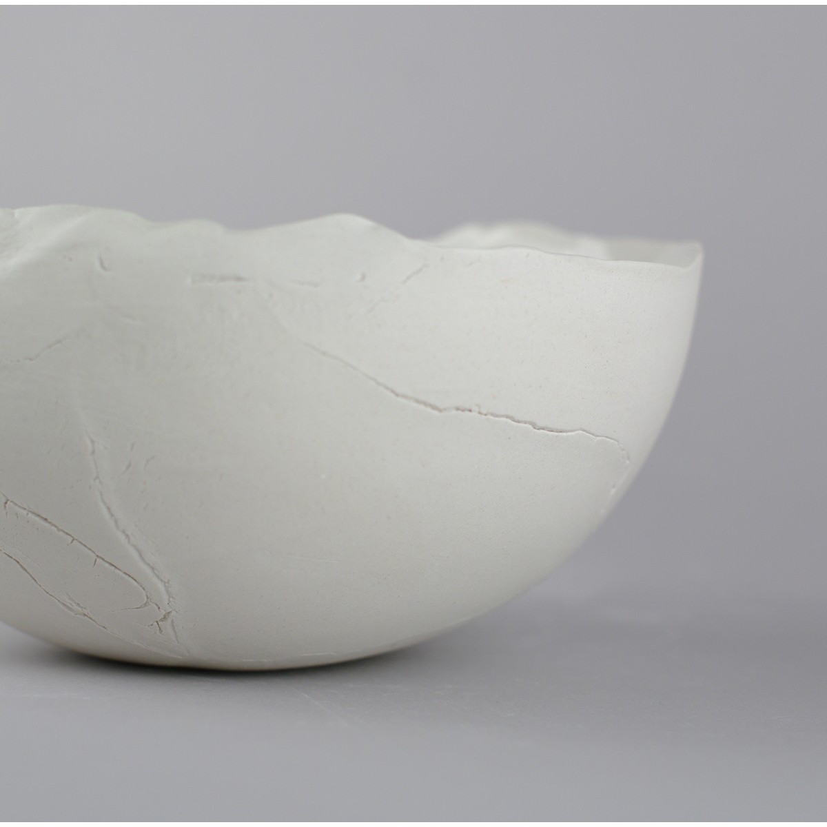 Ce bol en forme d'œuf est en porcelaine brute en extérieur et émaillée à l'intérieur. Les fissures esthétiques de la surface se conjuguent avec la douceur de la matière. Les lèvres finement découpées ajoute à l'aspect "coquille".