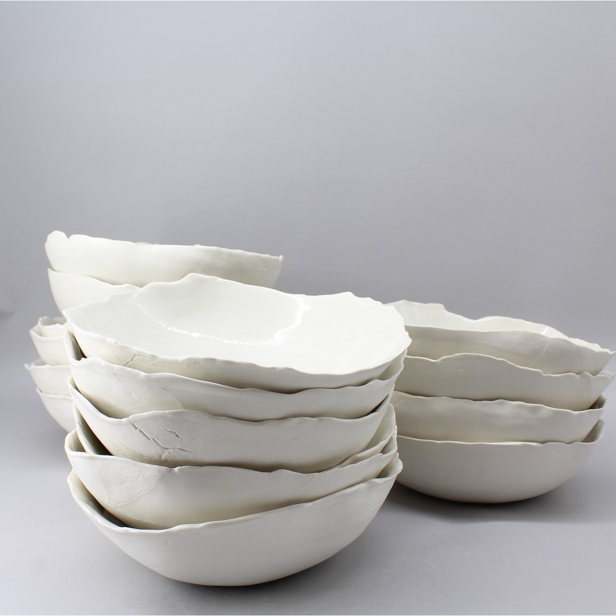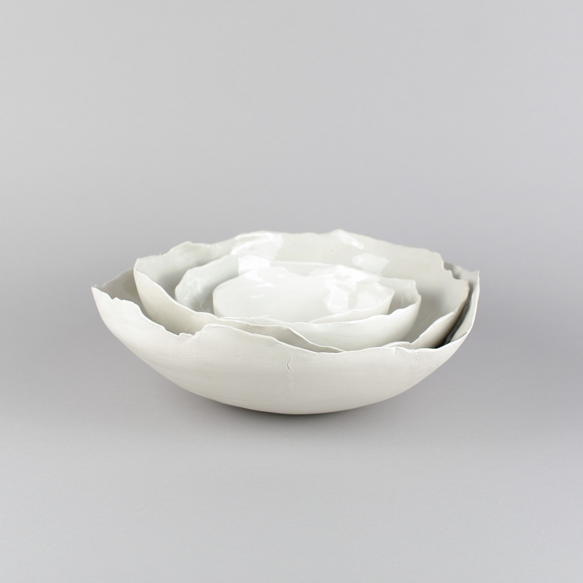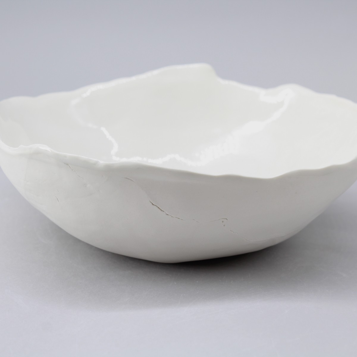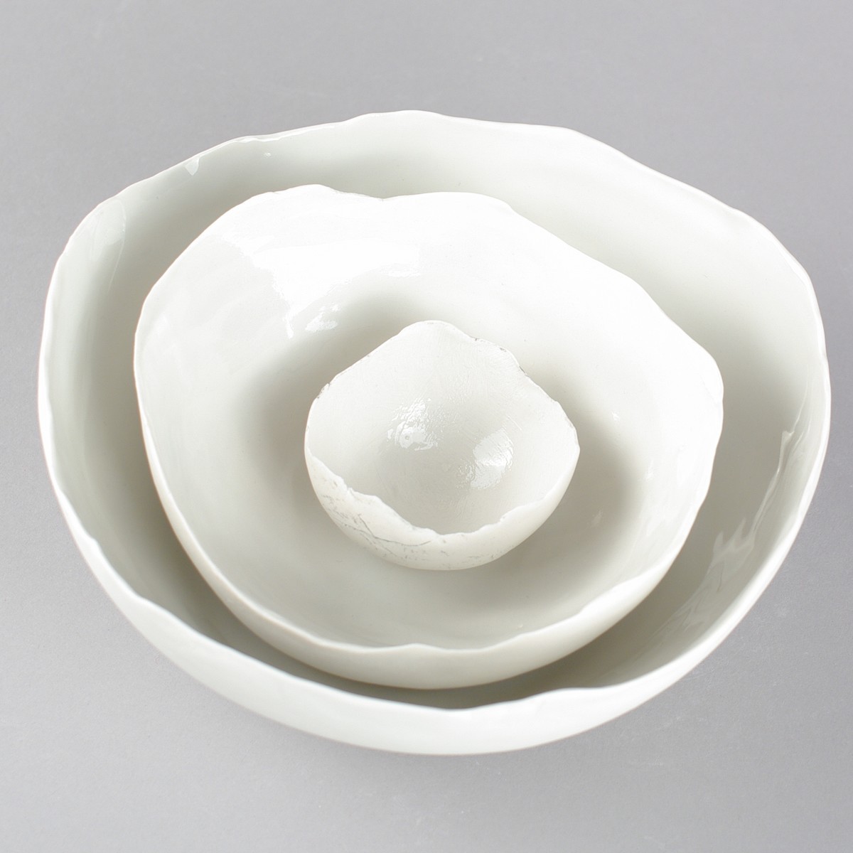 Ce bol en forme d'œuf est en porcelaine brute en extérieur et émaillée à l'intérieur. Les fissures esthétiques de la surface se conjuguent avec la douceur de la matière. Les lèvres finement découpées ajoute à l'aspect "coquille".
