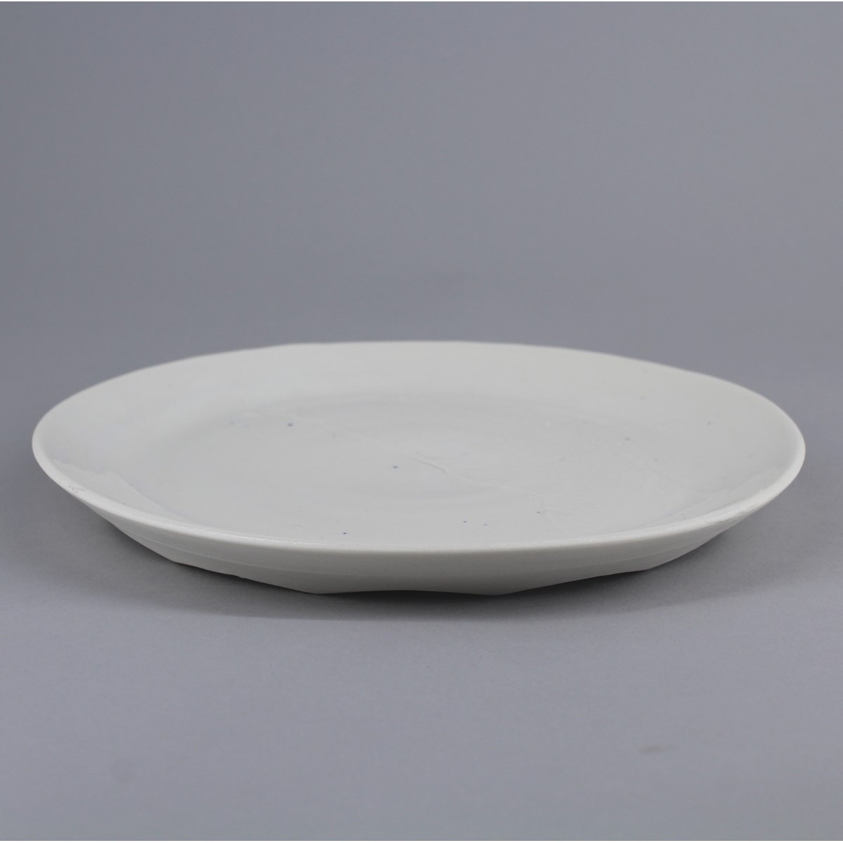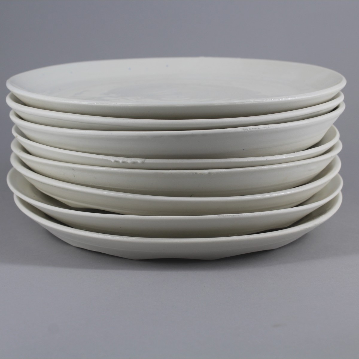 Assiettes en porcelaine avec un émail brillant en intérieur et une bande de porcelaine en relief. Le fond est découpé laissant apparaitre les traces lisses de l'outil. Légèrement ouverte pour faciliter l'empilage.
