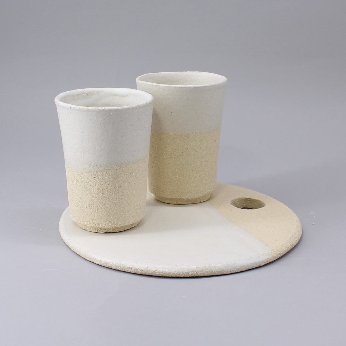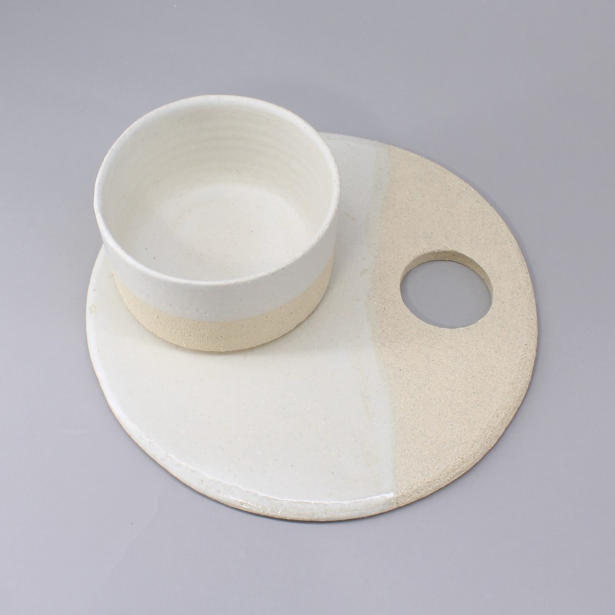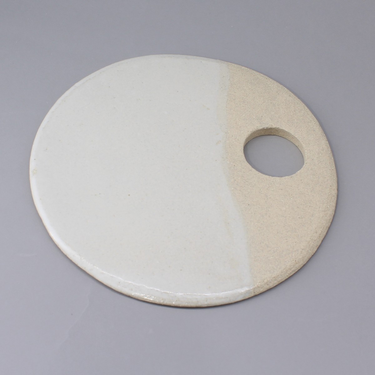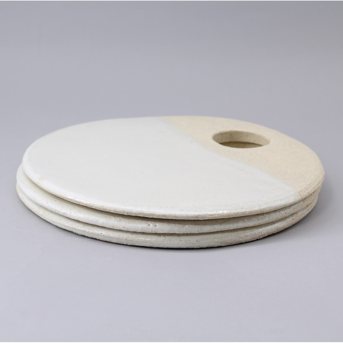 Plateau ou assiette de présentation de la collection "Authentique". En grès blanc, il est suffisamment léger pour une bonne prise en main. Légèrement rugueux sur 1/3 il est émaillé blanc mat très doux contraste pour un effet naturel très agréable.