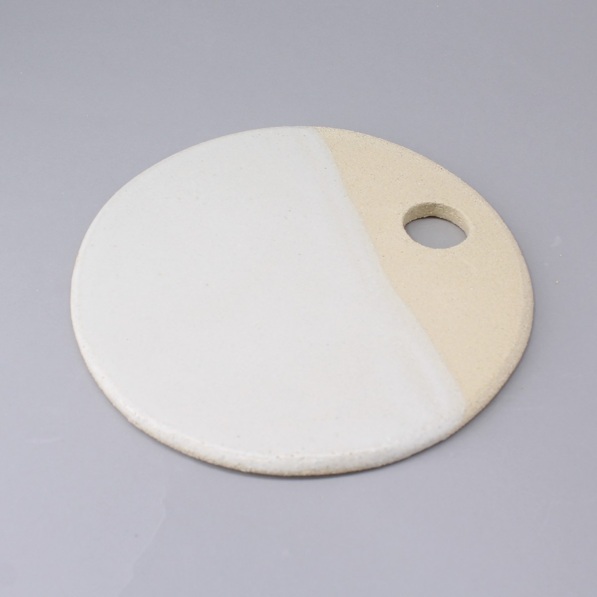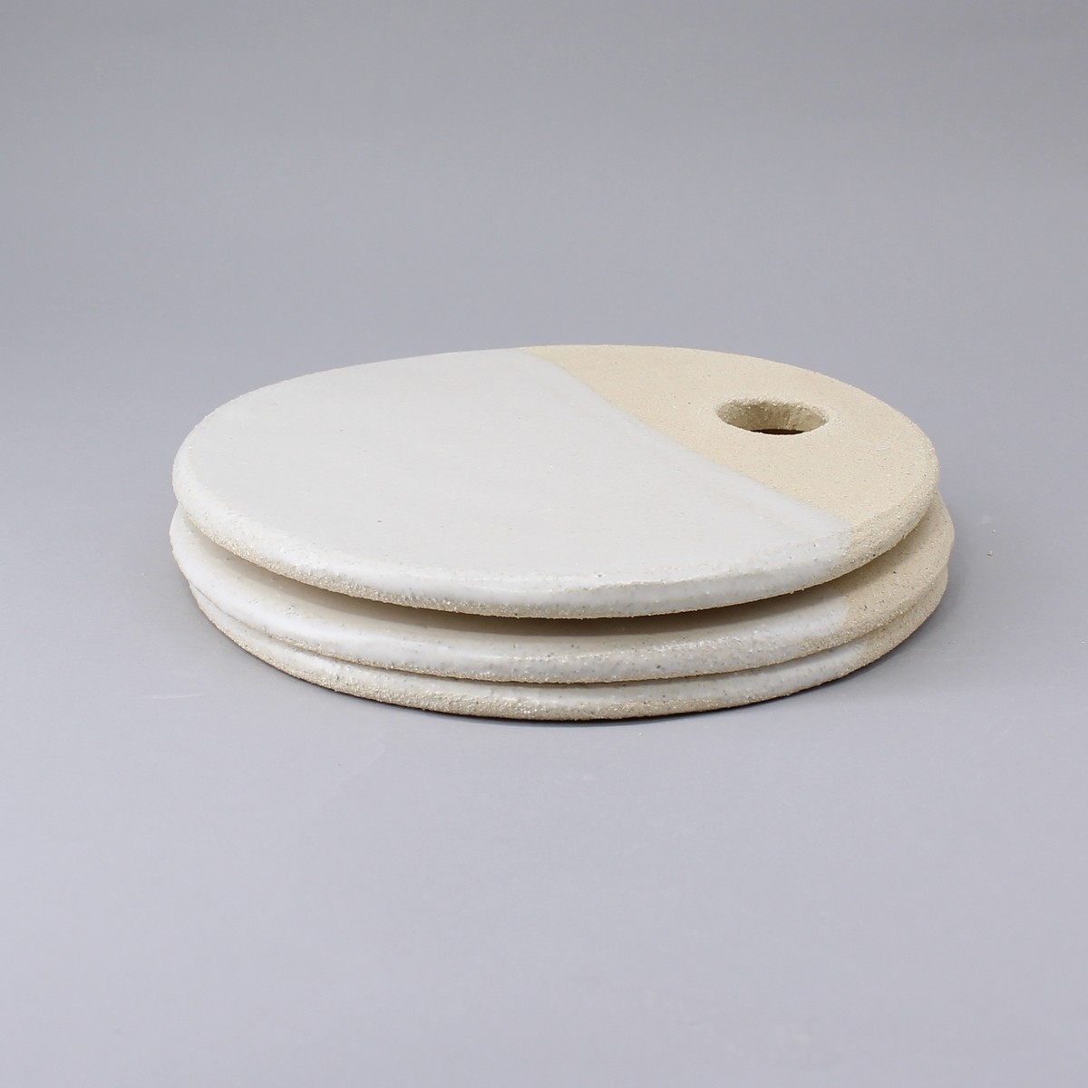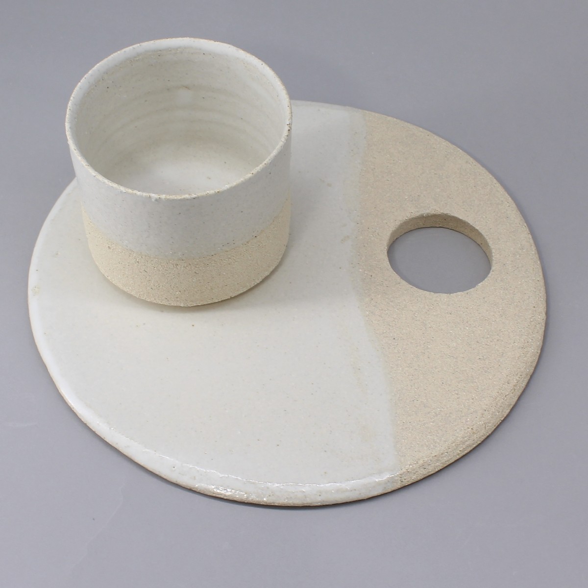 Plateau ou assiette de présentation de la collection "Authentique". En grès blanc, il est suffisamment léger pour une bonne prise en main. Légèrement rugueux sur 1/3 il est émaillé blanc mat très doux contraste pour un effet naturel très agréable.