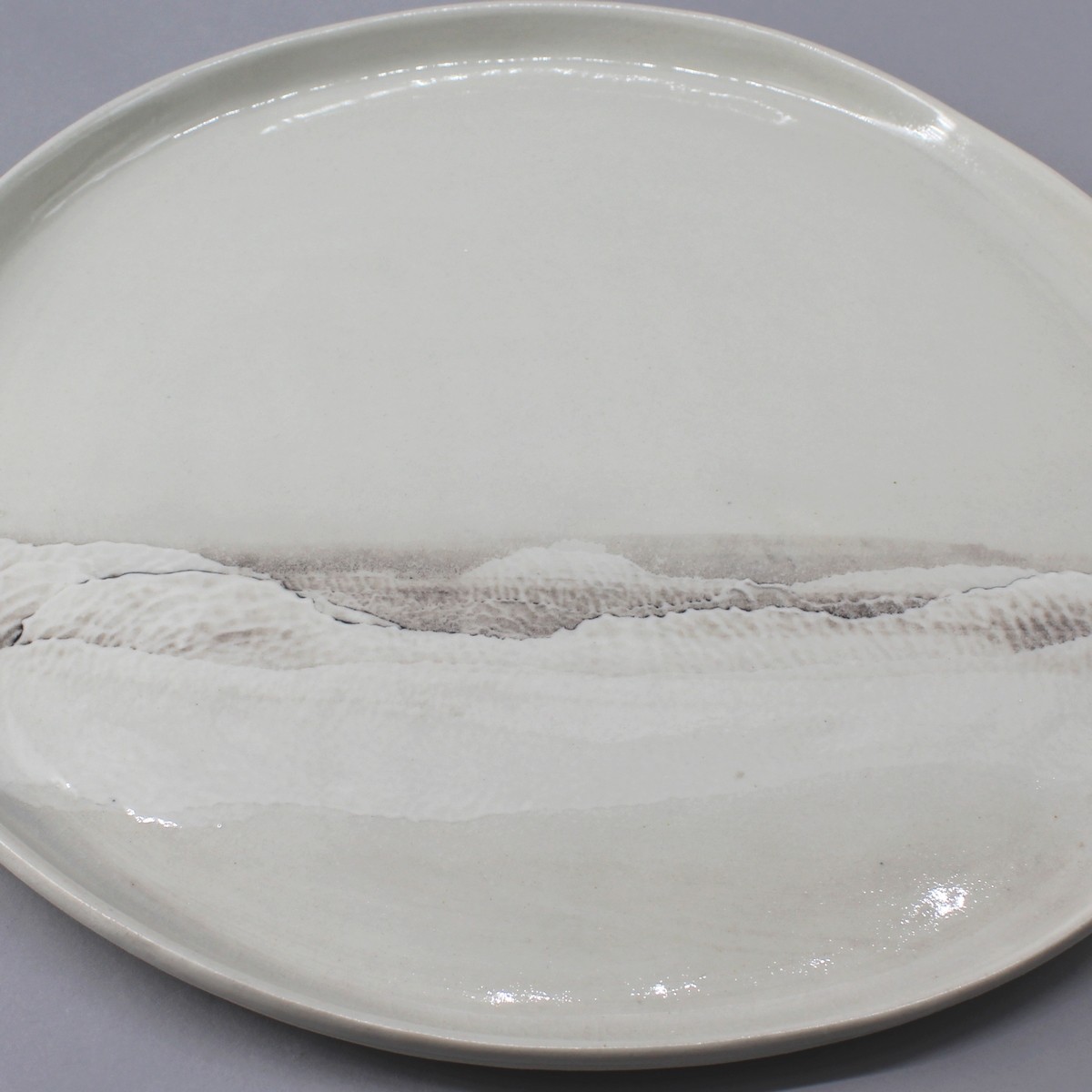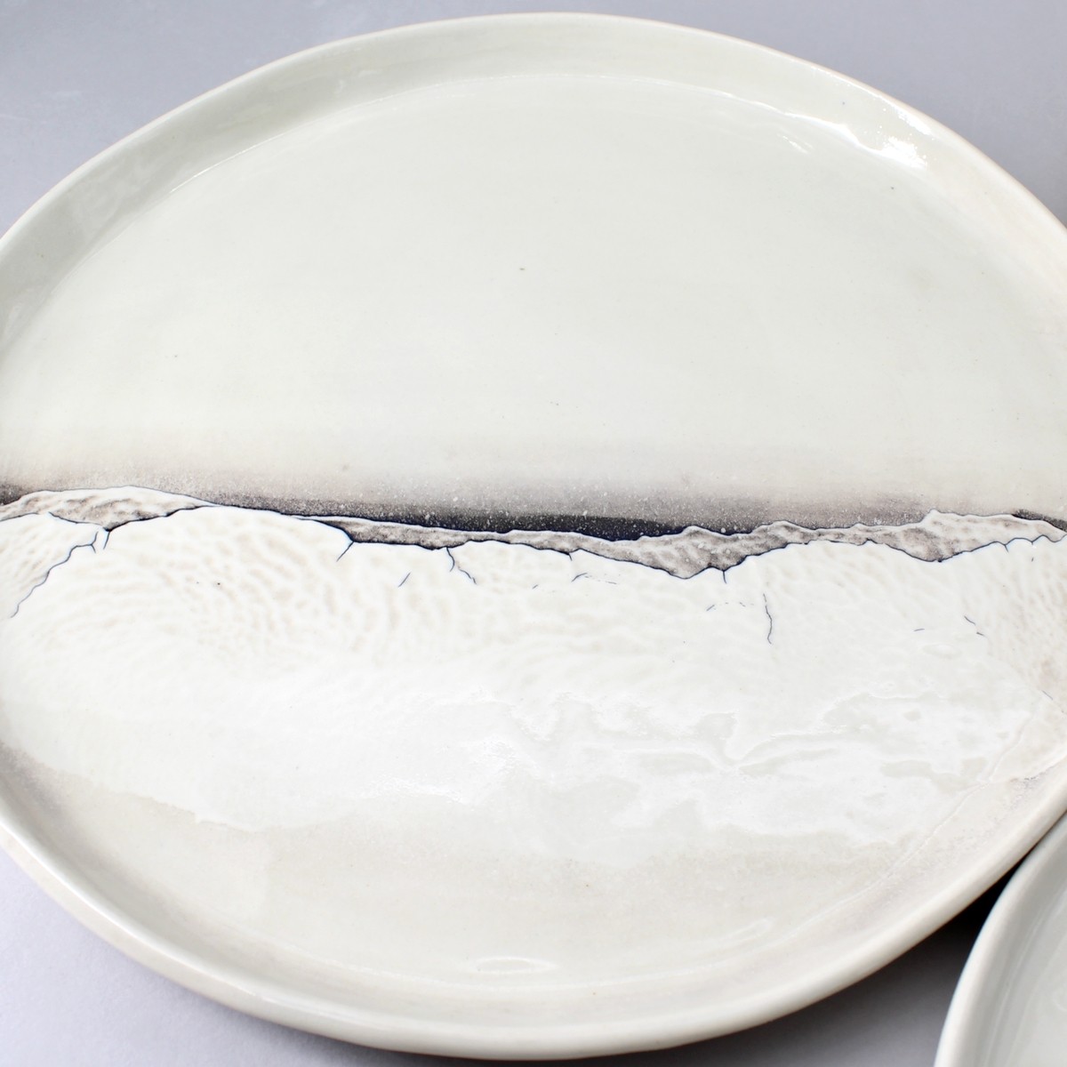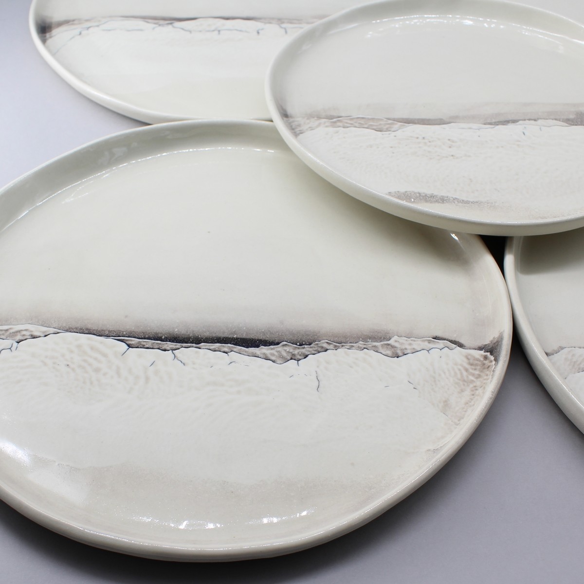 Assiette plate en porcelaine faite main avec petit rebord de 1 m. Forme contemporaine décorer en 1/3 avec relief de la collection "Aléasucs" chaque pièce est unique car le décor, paysage est assorti mais chaque fois unique. Diam 25/26 cm. Possible sur-mesure.