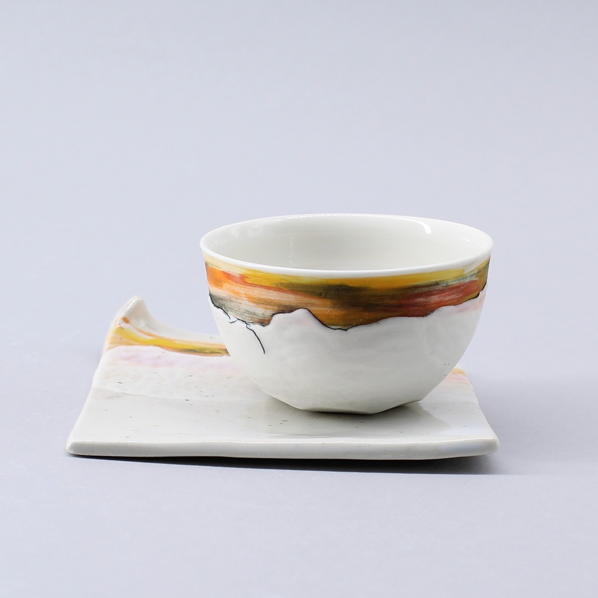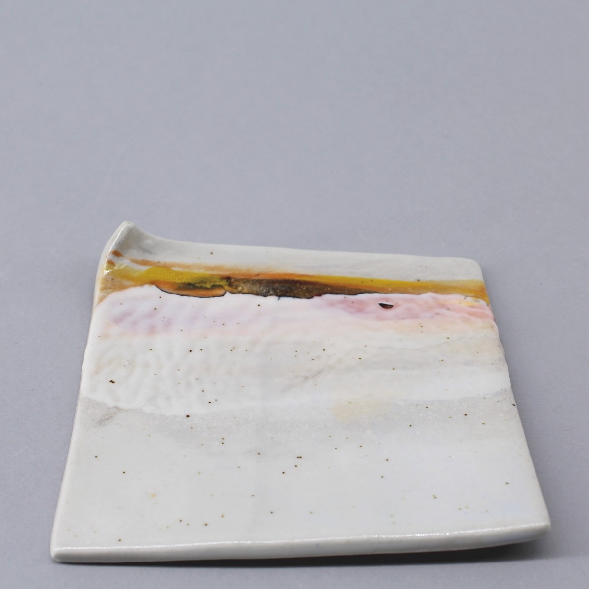 Soucoupe en porcelaine, carré 10/10 cm légèrement surélevé en angle sur un coin. Impression de reliefs type "Ô ciel" en couché de soleil.