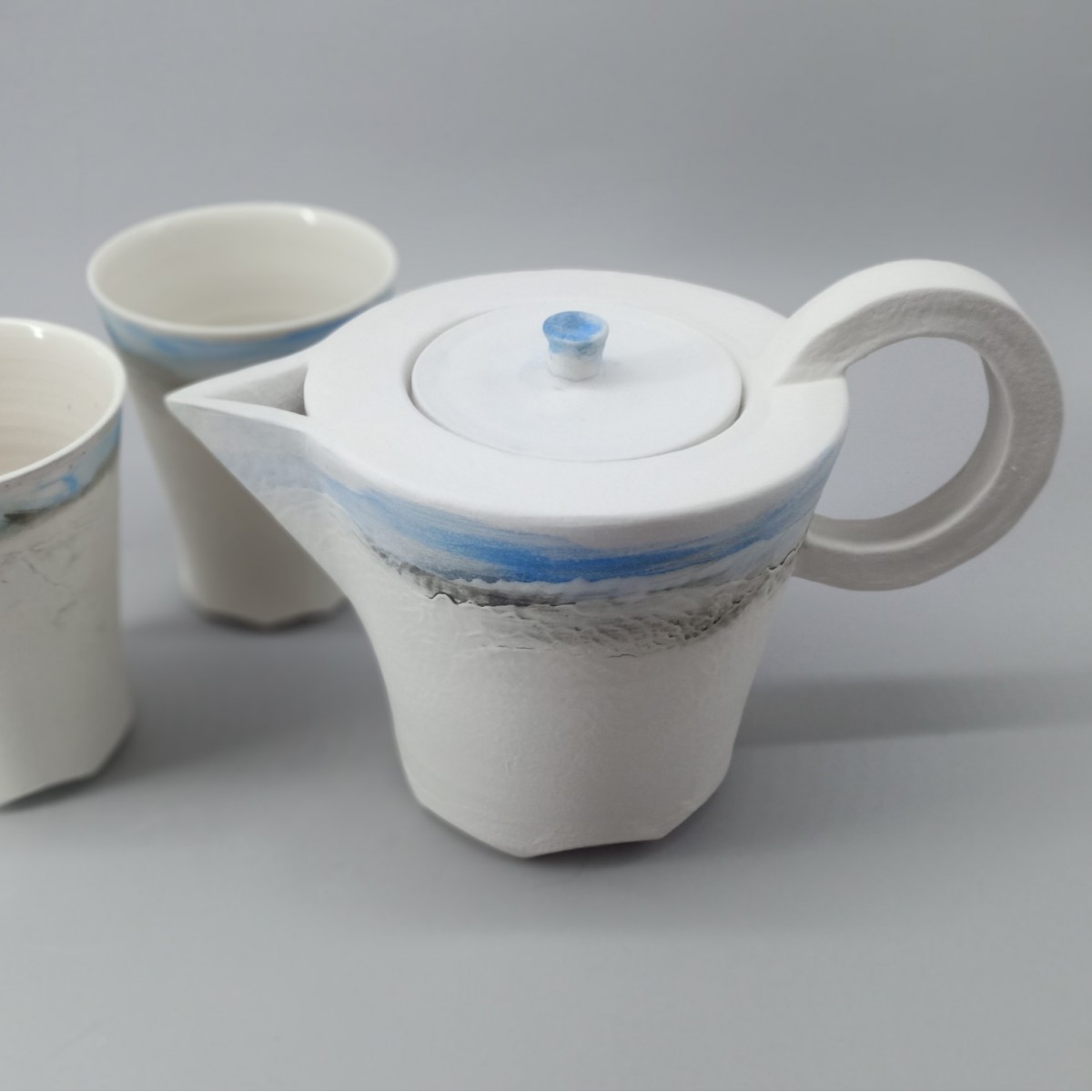 Déclinaison sur-mesure de la collection "Aléasucs" pour une théière et deux mugs. Des amoureux de ciel bleu et de thé.