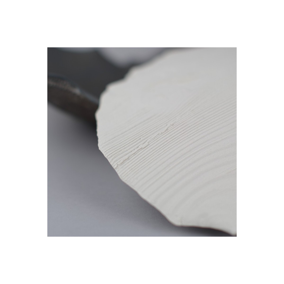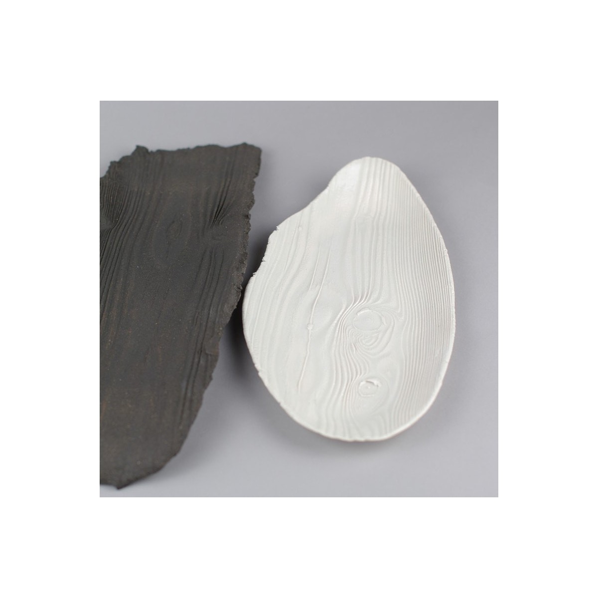 Ce plat de présentation en porcelaine de la collection « Trompe l’ œil », joue avec l’impression de bois. La finesse de la porcelaine devient matière déchirée. Les plats comme toutes les pièces de l’atelier « Entre Terres » sont issus d’un travail à la main sans aucun solvant ni toxique, toutes les matières premières sont fabriquées à l’atelier en respectant l’environnement. Elles sont résistantes et passent au lave-vaisselle…Toutes les pièces sont uniques.
