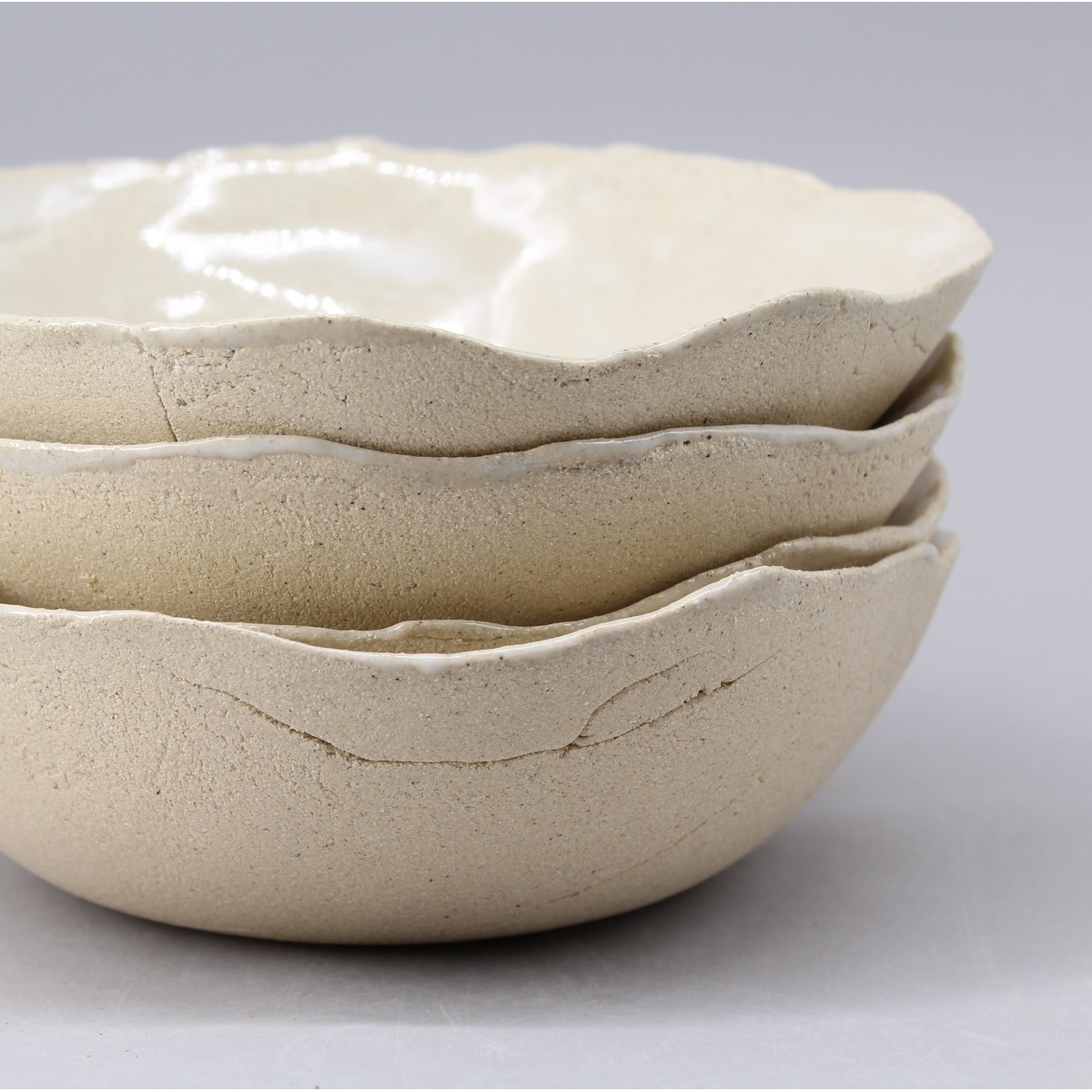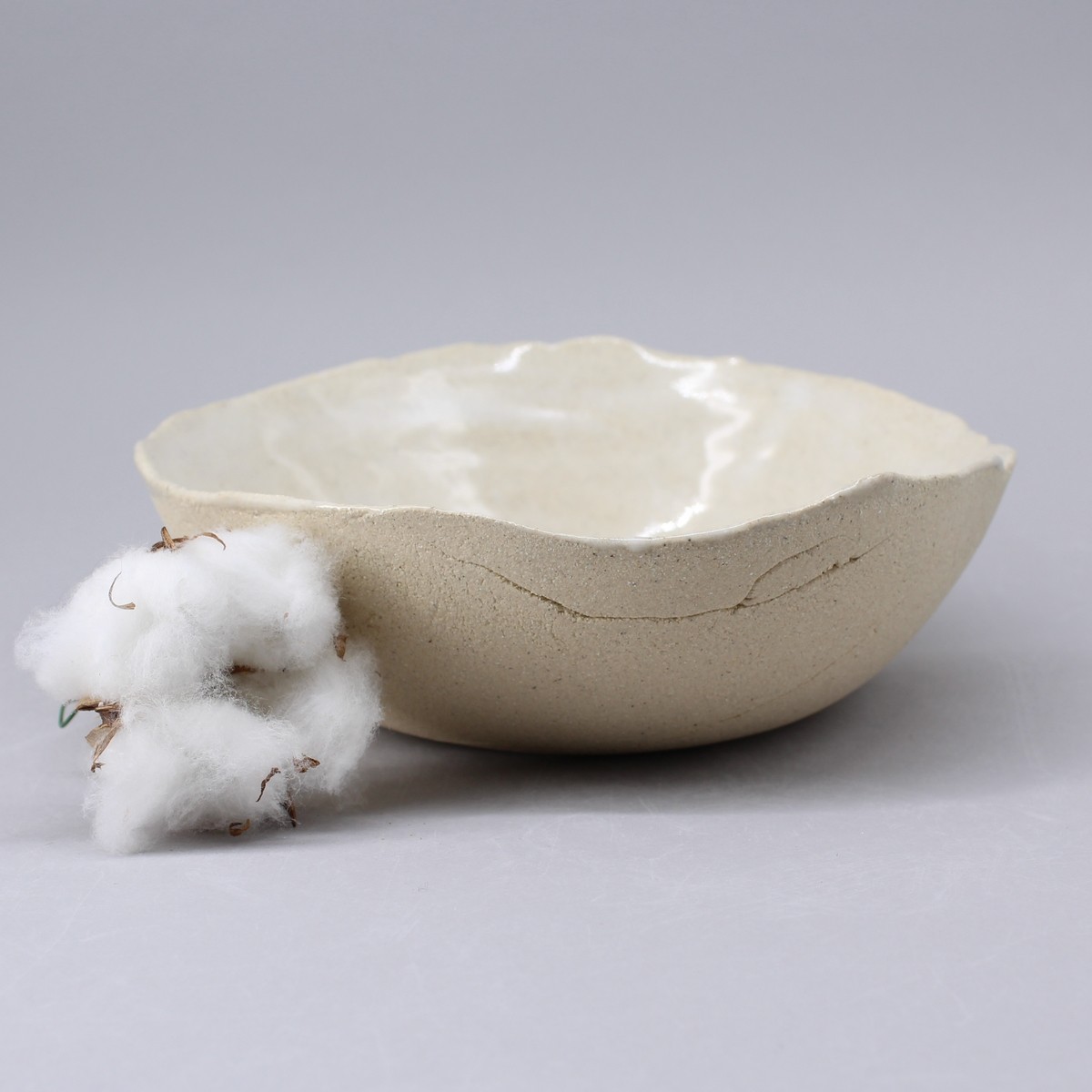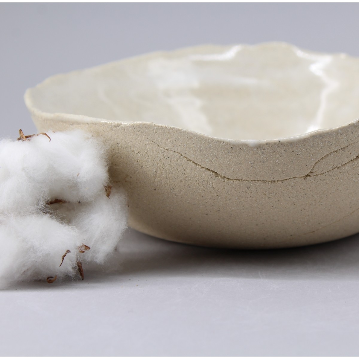 Bol à fond plat ou assiettes creuse, en grès blanc émaillé en blanc brillant en nuance givrée en intérieur et laissé brut en extérieur. Fissures sur l'extérieur qui servent le décor et n'altèrent pas la résistance des pièces.