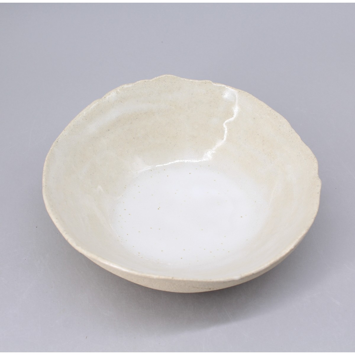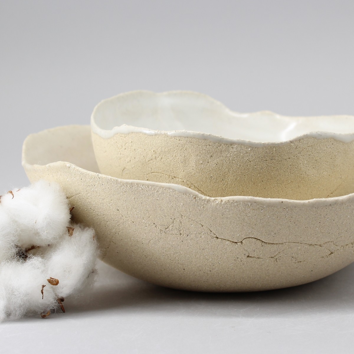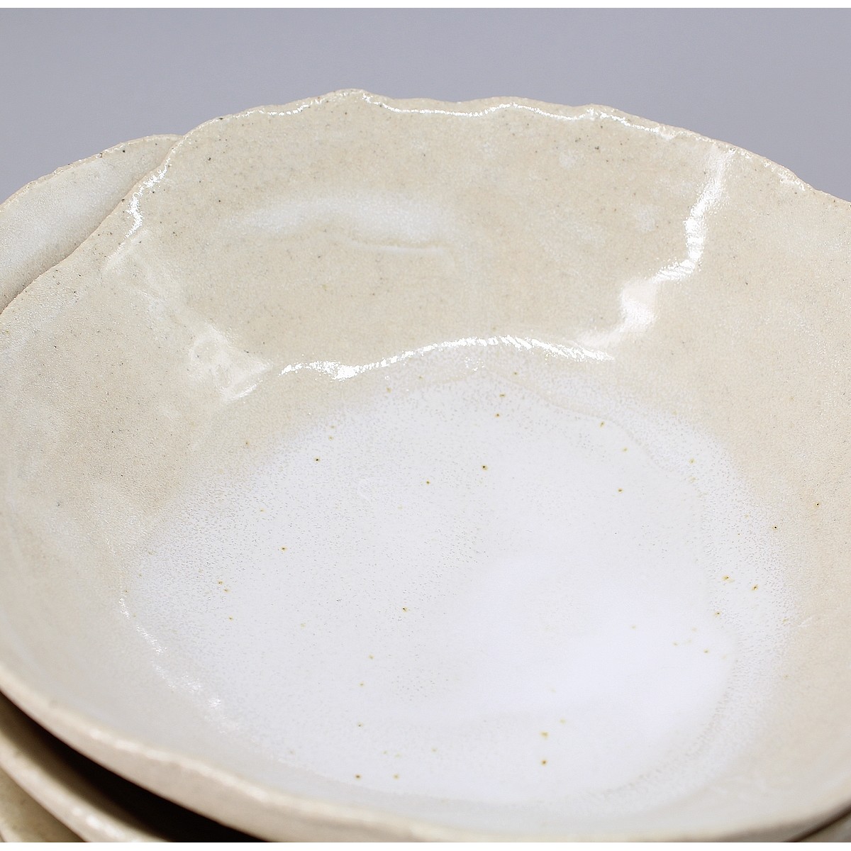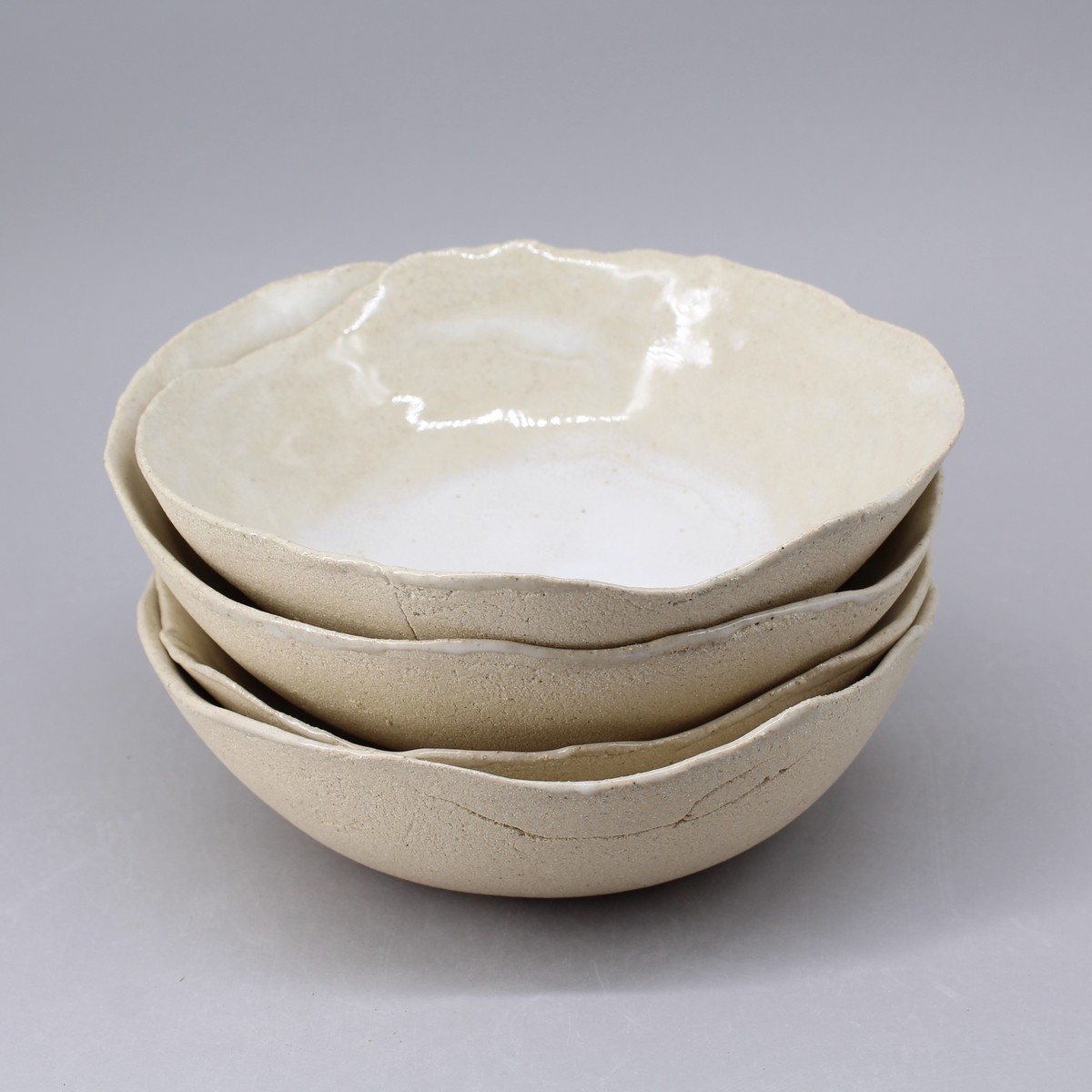 Bol à fond plat ou assiettes creuse, en grès blanc émaillé en blanc brillant en nuance givrée en intérieur et laissé brut en extérieur. Fissures sur l'extérieur qui servent le décor et n'altèrent pas la résistance des pièces.