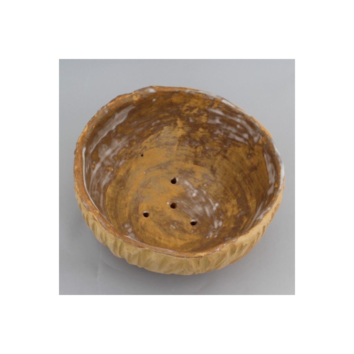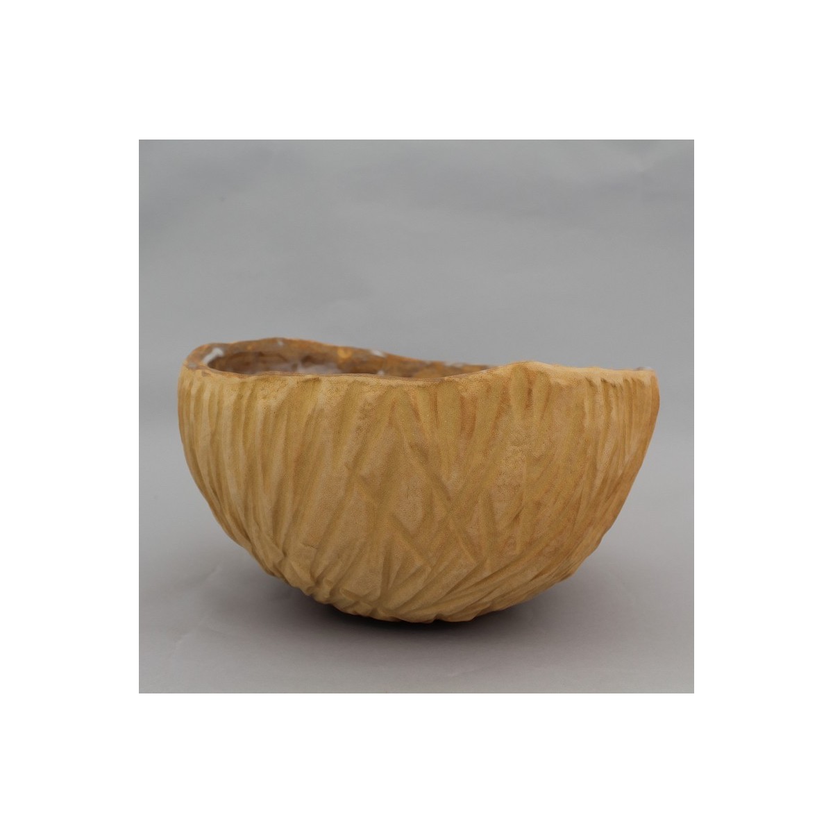 Cette demi coquille en grès roux convient parfaitement aux cactées et au bonzaïs. l’impression de matière du grès extérieur contraste avec un émail léger blanc en intérieur