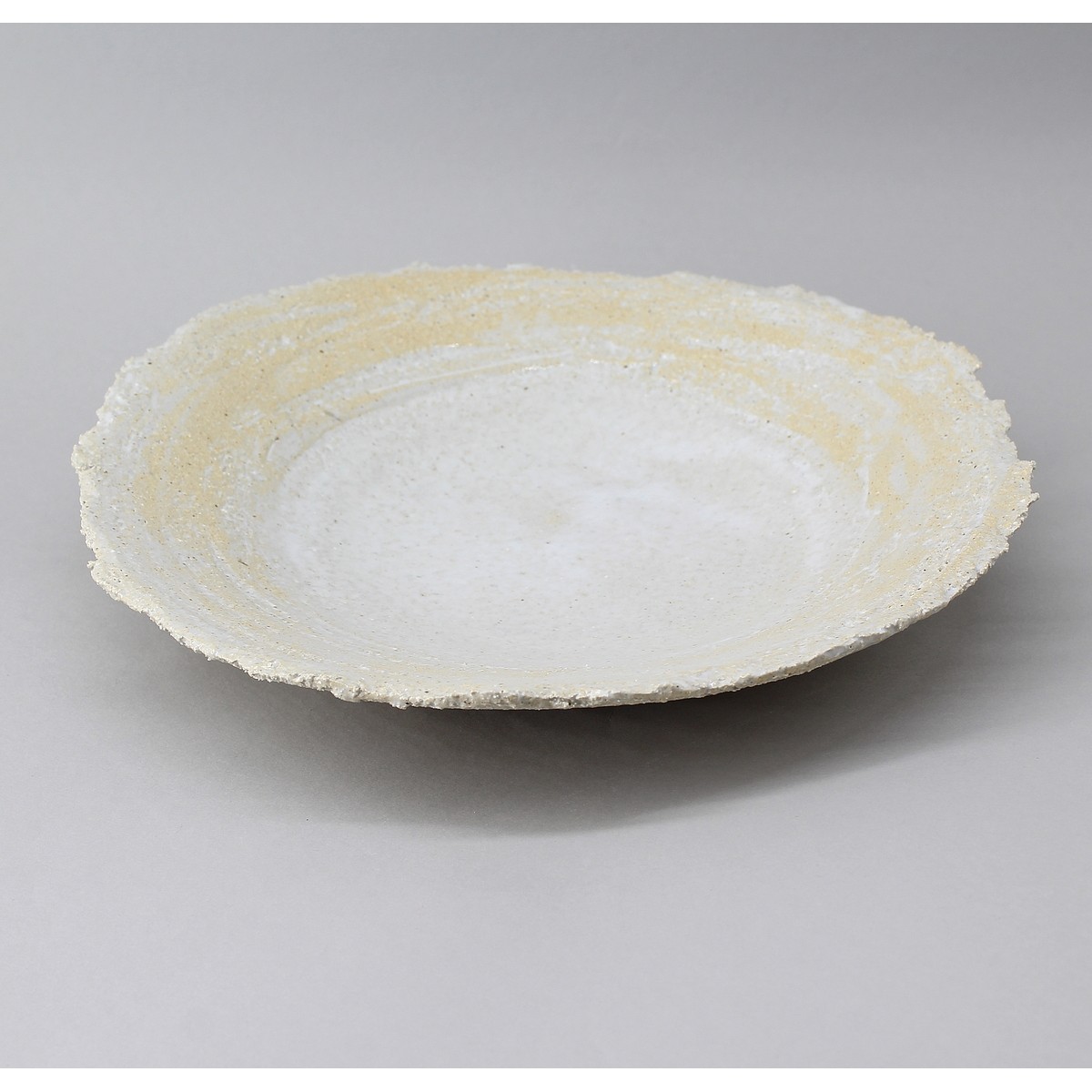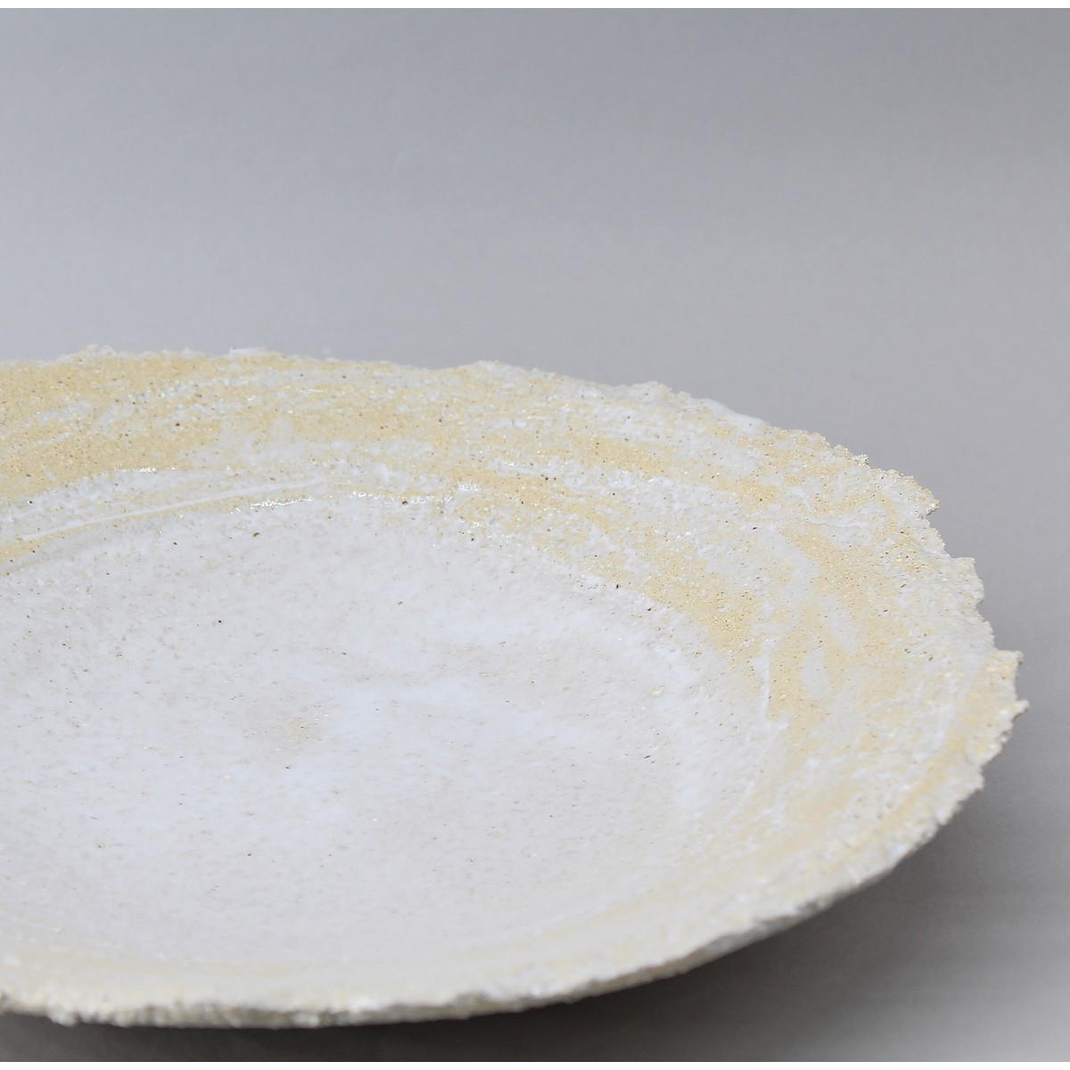 Assiette creuse en fond plat, les bords sont déchirés et le 1/3 supérieur est travaillé pour faire ressortir la matière brute de la terre. Le grès est émaillé lisse au fond de l'assiette pour la zone de dressage. L'émail est essuyé sur le tiers supérieur de la pièce.