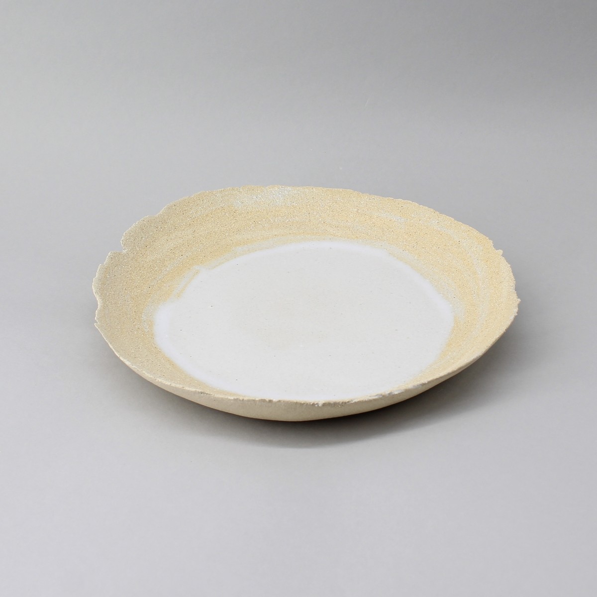 Assiette creuse fond plat en grès blanc. Fond de dressage émaillé lisse et bordures brutes sablées. Bords déchirés.