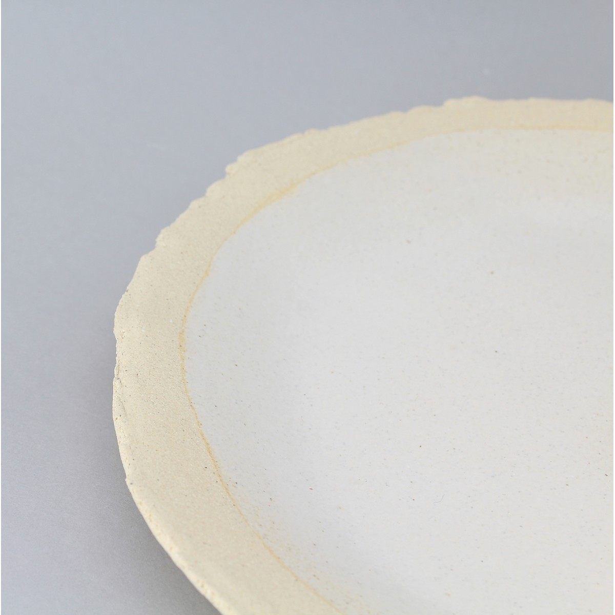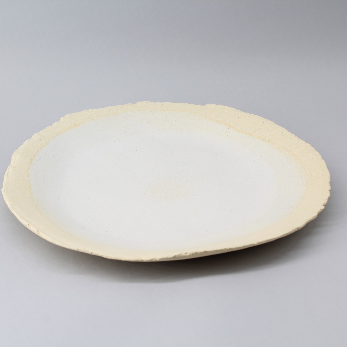Assiette plate grès blanc faite main, bord adouci et légérement relevé. Fond de dressage large émaillé lisse . 2 cm de bord brut .