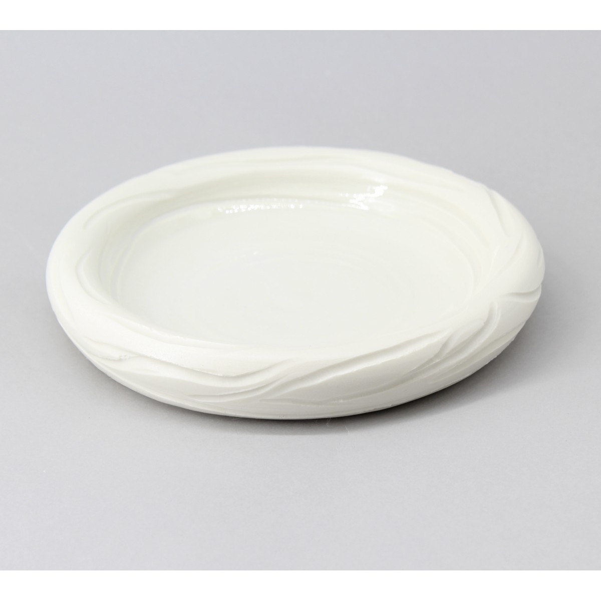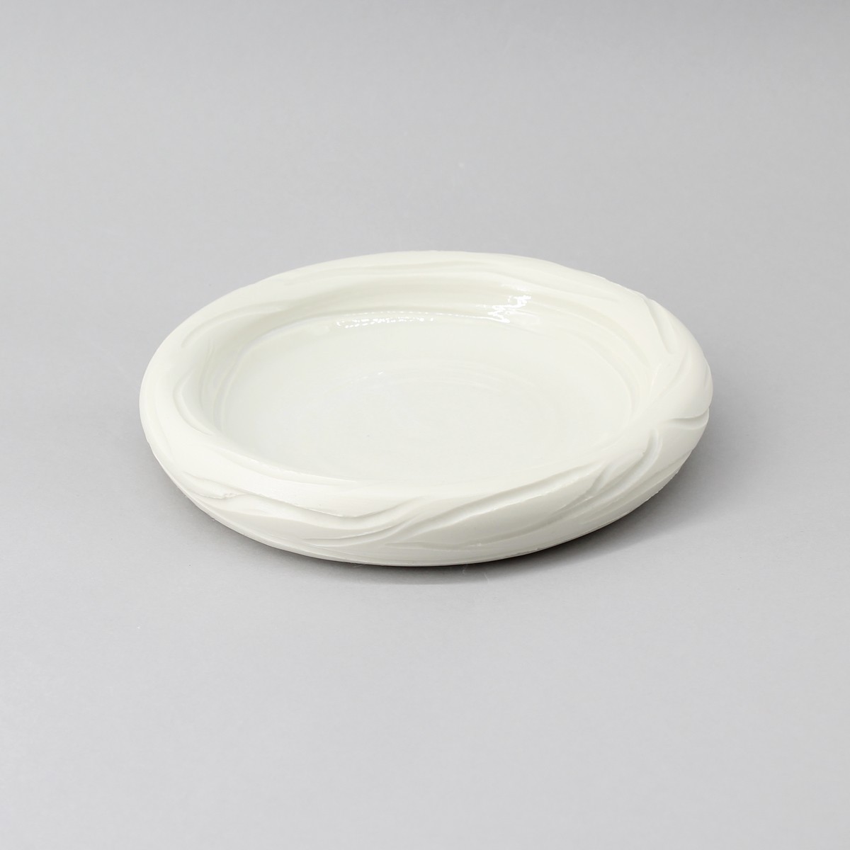 Assiette en porcelaine de Limoges pure tournée en bords recourbés puis gravé. Les gravures sont proposées aux clients en fonction de ses inspirations, pour personnaliser l'effet de matière.