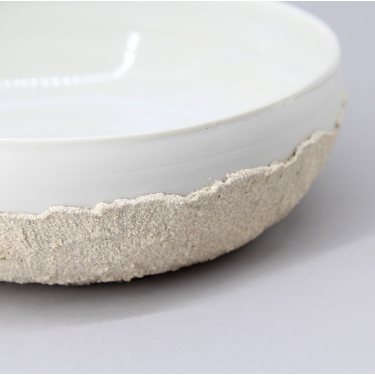 Assiette en porcelaine tournée puis façonnée en duo avec un grès rugueux. La couleur du grès est beige ou roux, il est appliqué pour créer différents effets en fonction des souhaits du client.