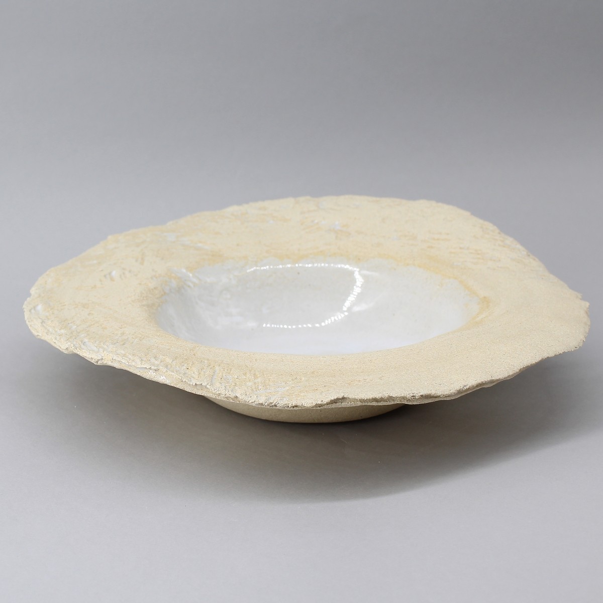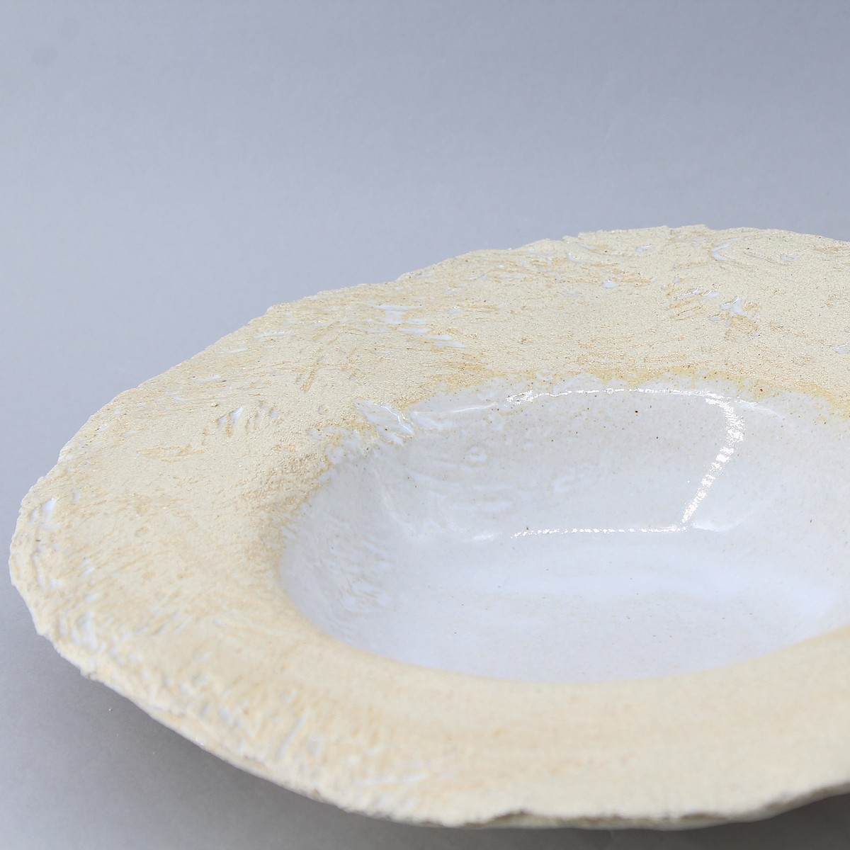 Assiette creuse avec ailette déchirée et imprimée . Zone de dressage en creux bol émaillé. Ailette émail essuyé pour faire ressortir les impression de matière. Choix des impressions avec le client. Possibilité de laisser les bords d'assiette brutes.