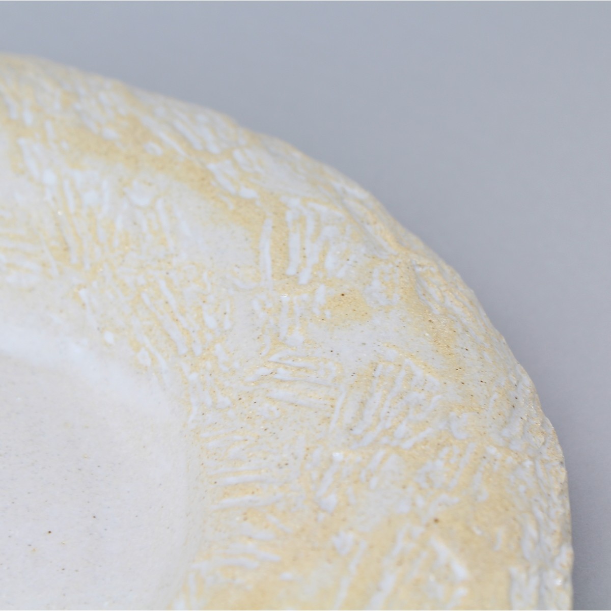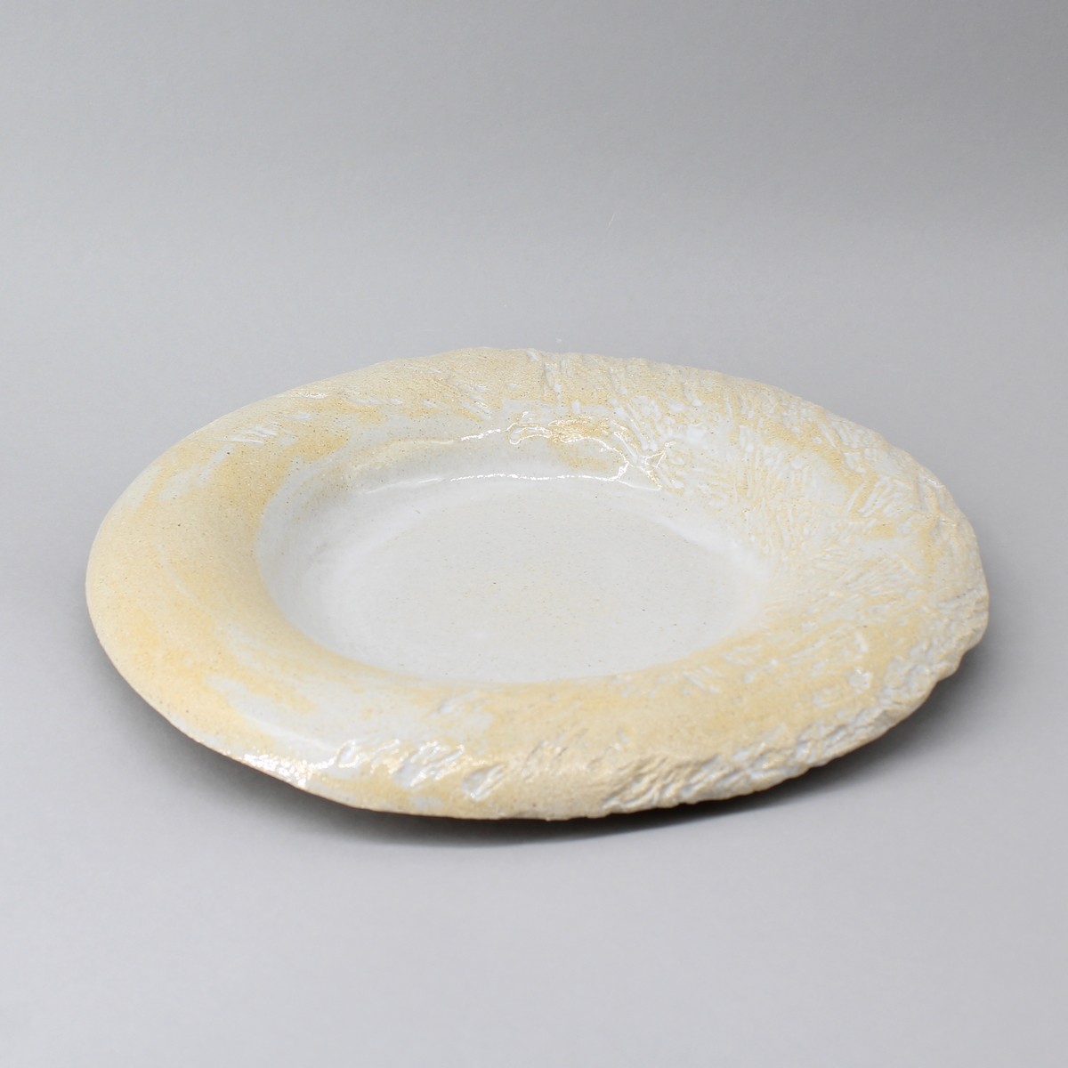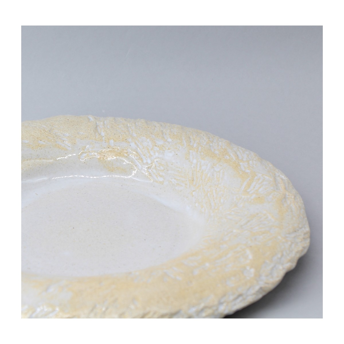 Assiette creuse avec ailette courbée et imprimée. Zone de dressage en creux plat émaillé. Ailette émail essuyé pour faire ressortir les impressions de matière. Choix des impressions avec le client. Possibilité de laisser les bords d'assiette brutes.