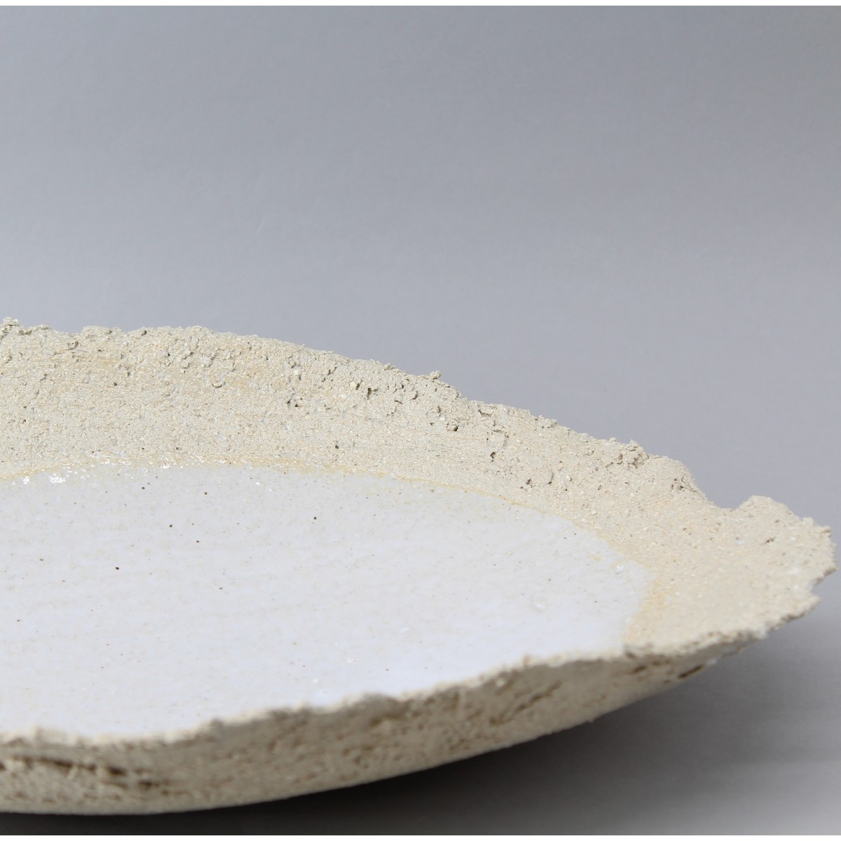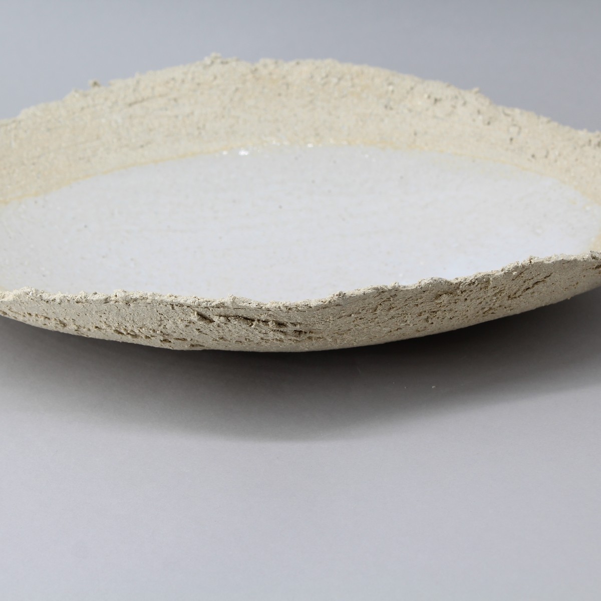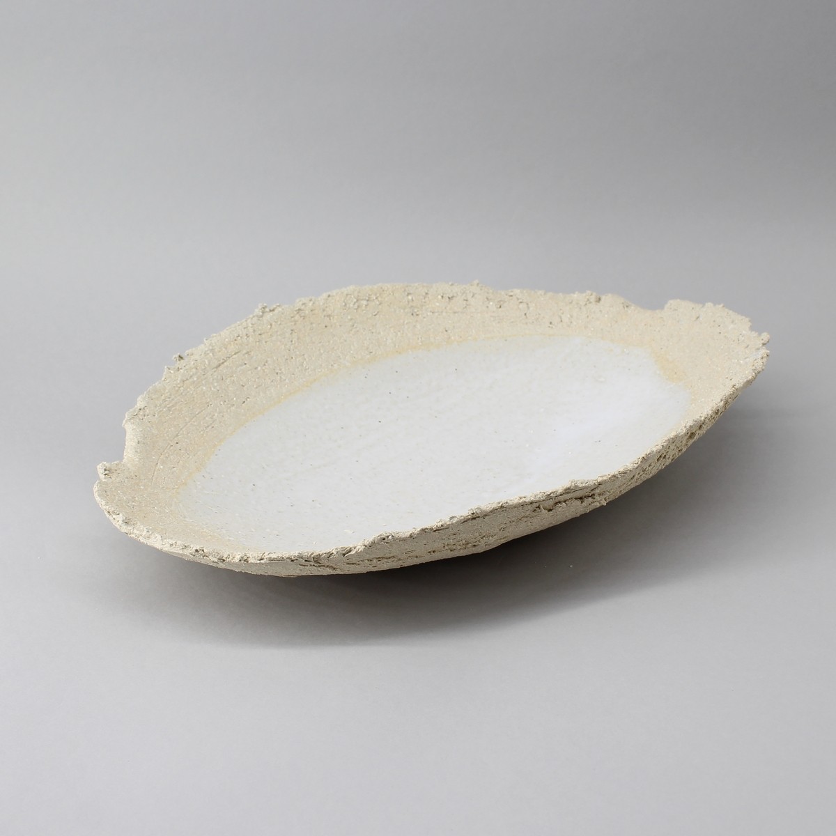 Assiette ovale forme barquette en grès blanc très rugueux . Bords déchiffrés affinés, intérieur émaillé lisse pour dressage, bordure et extérieur brute.
