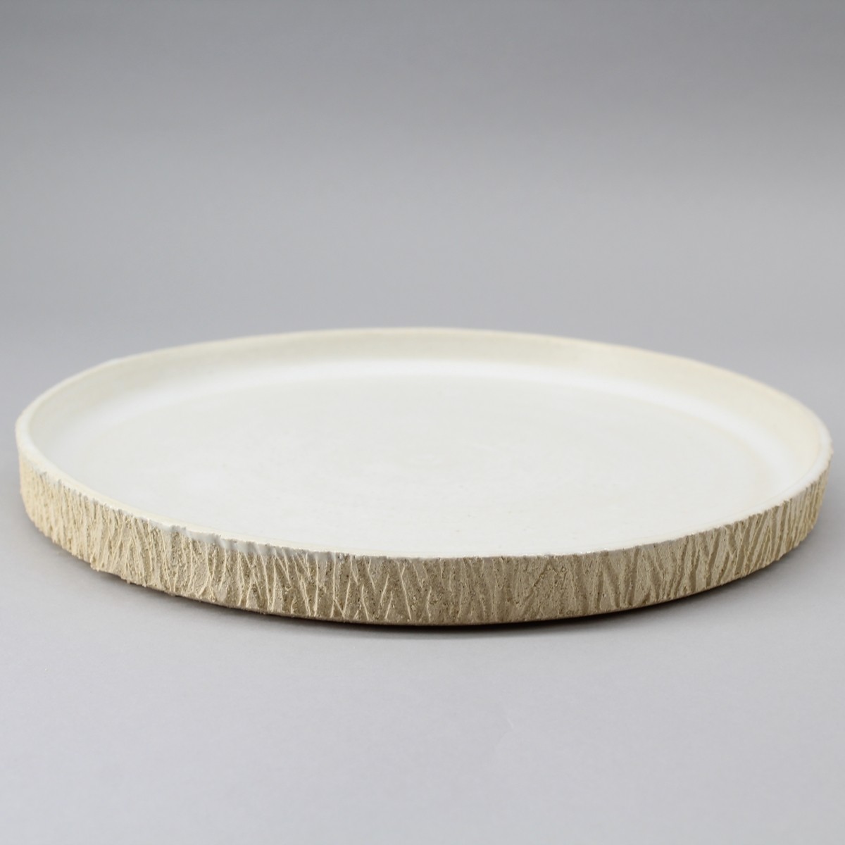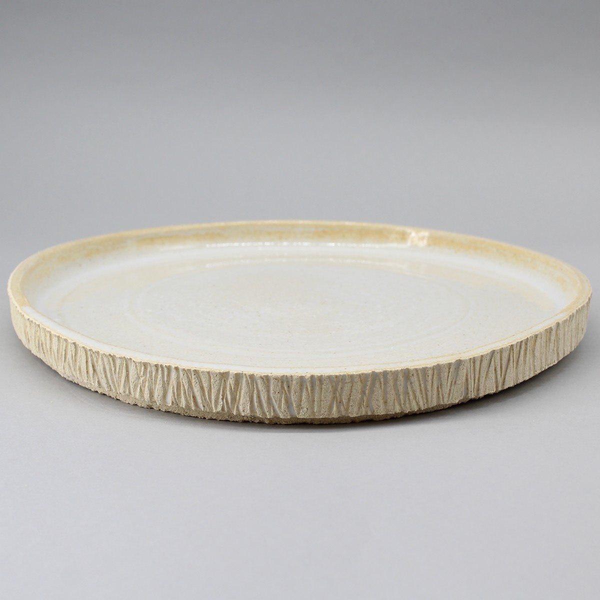Assiette plate tournée bord droit gravé.