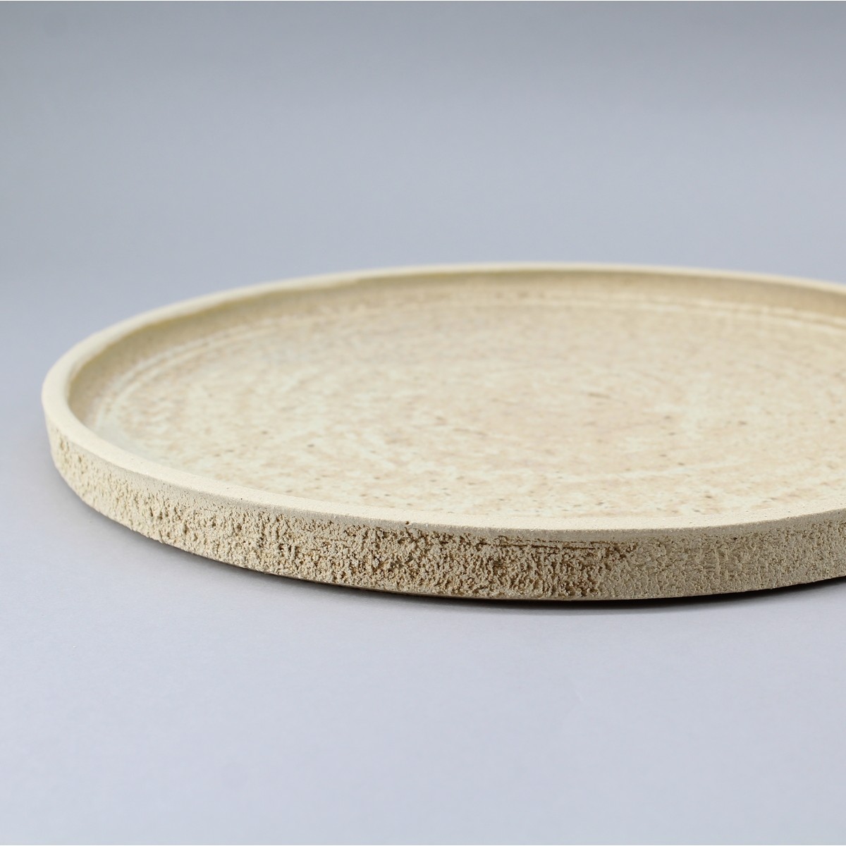 Assiette plate bord droit. émail intérieur chiné beige et marron.