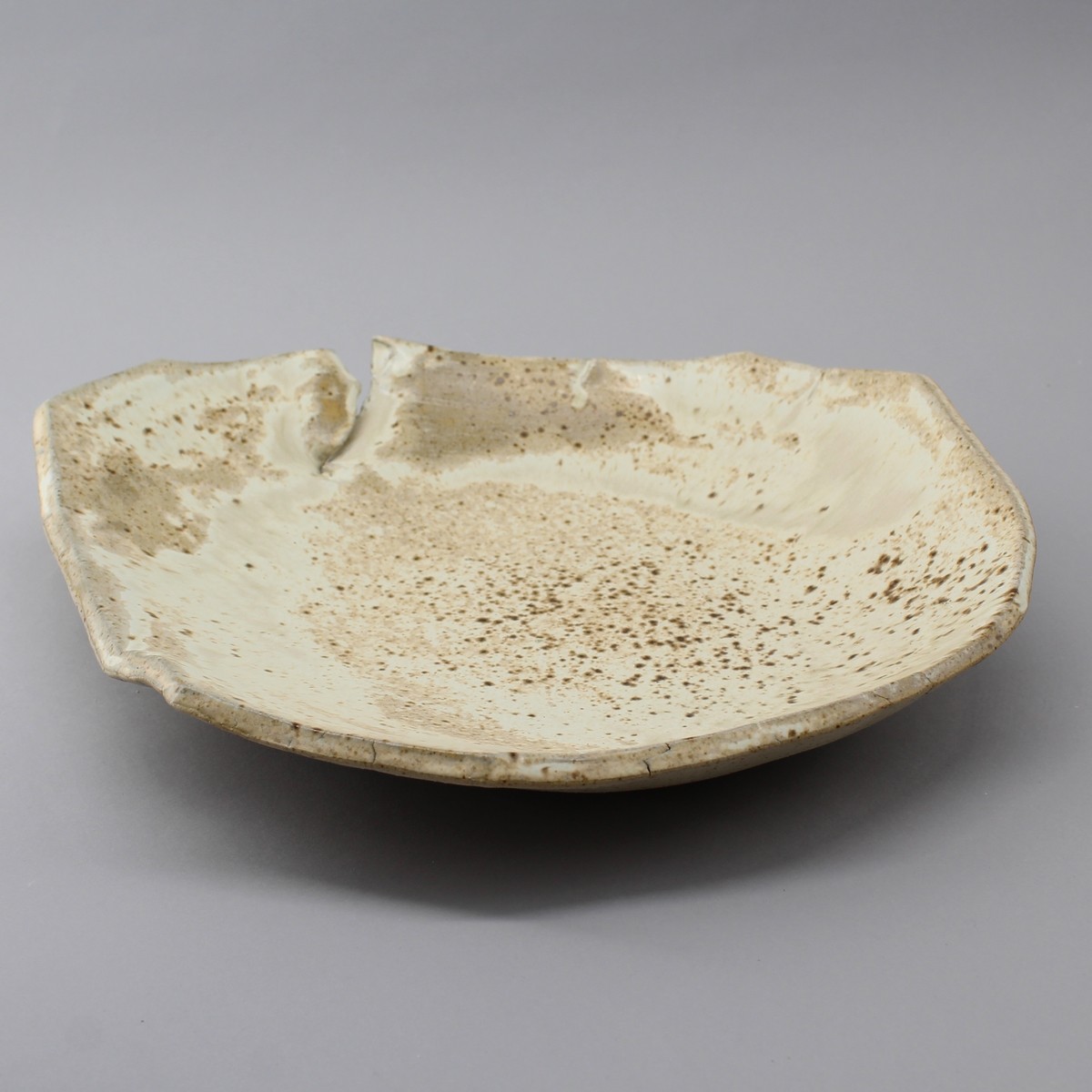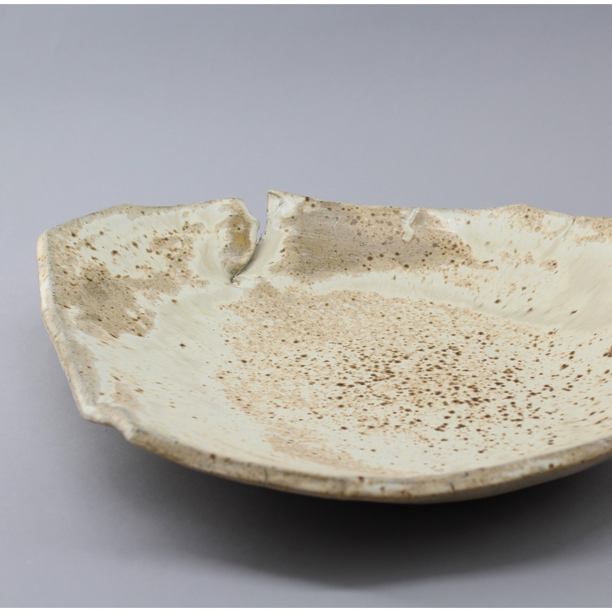 Assiette creuse façonnée à la plaque découpe au couteau déchirure maitrisée sur une face. Grès vanillée éamil chiné roux et beige.