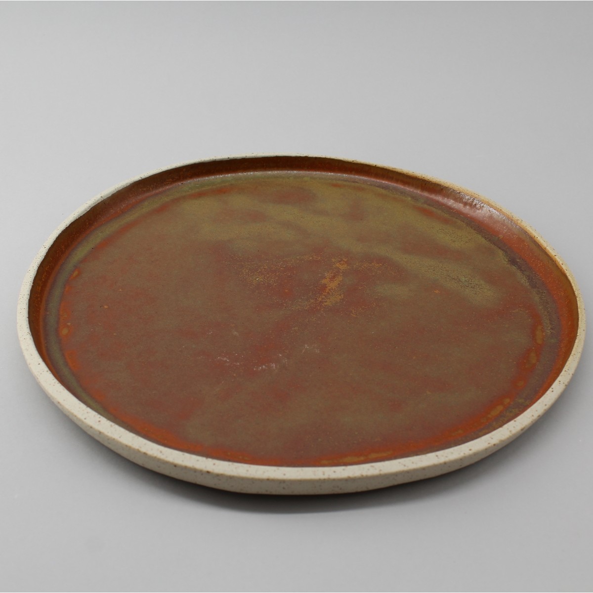 Assiette plate, grès beige vanillé, émail roux à reflets.