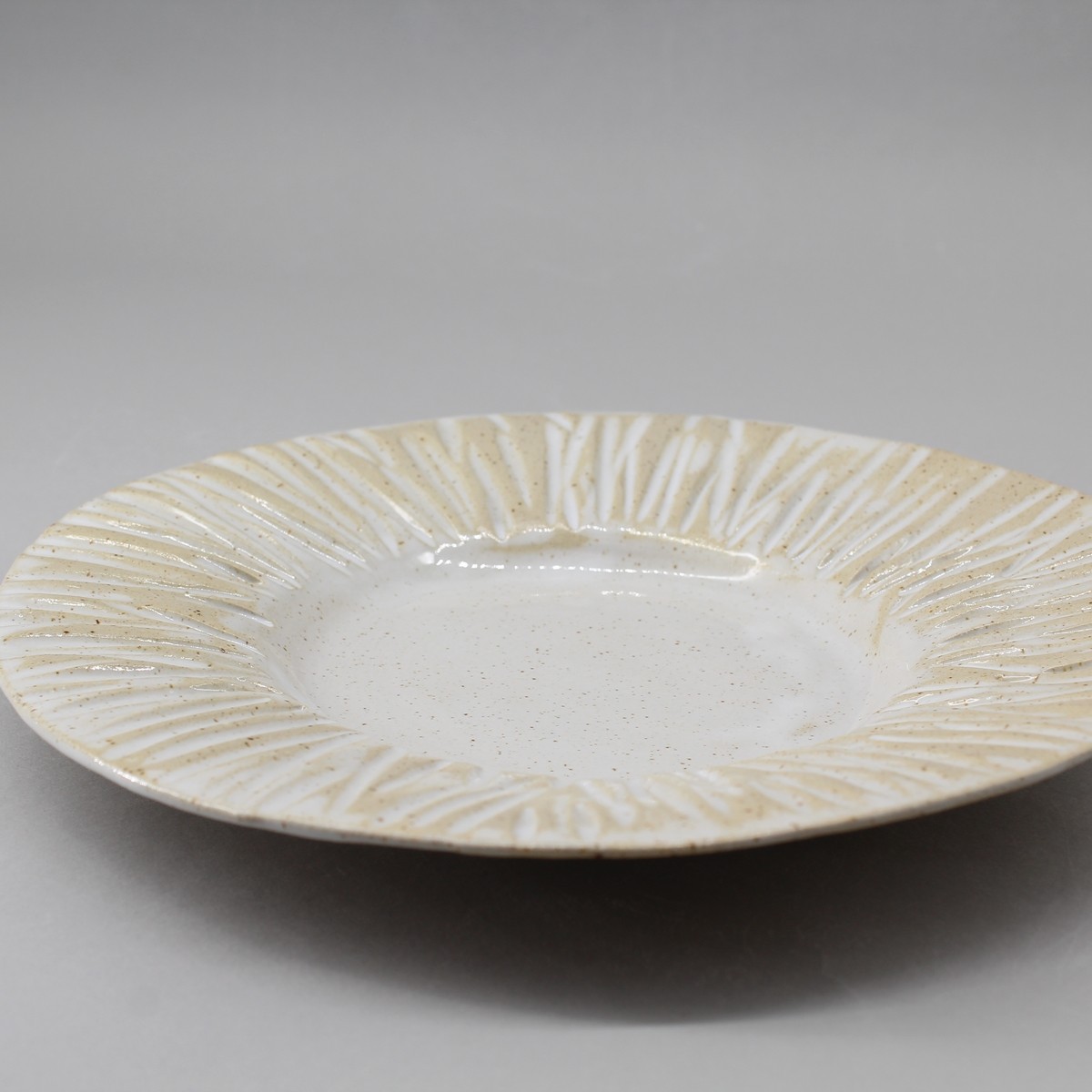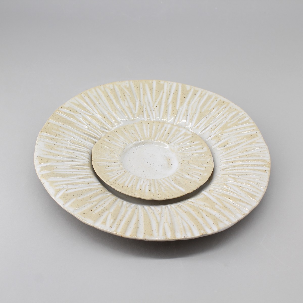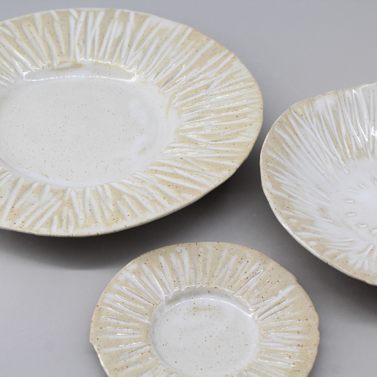 Série d'assiettes plate et semi creuse , inspiration pétales . Grès vanillé et émail blanc essuyé.