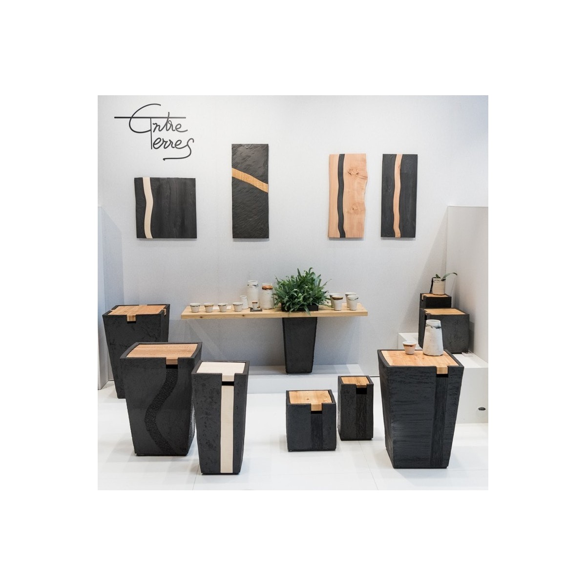 Les tables basses « Pyra » se plaisent dans toutes les pièces de la maison. Au salon mais aussi à la salle de bain où elles se transforment en panière à linge confortables pour s’y assoir. Ces tables d’appoint associent la douceur du bois et la terre rugueuse pour un résultat de contraste. Chaque pièce est travaillée en fonction du mariage bois terre, le veinage du bois et le travail d’impression de la base en grès doivent être en harmonie.