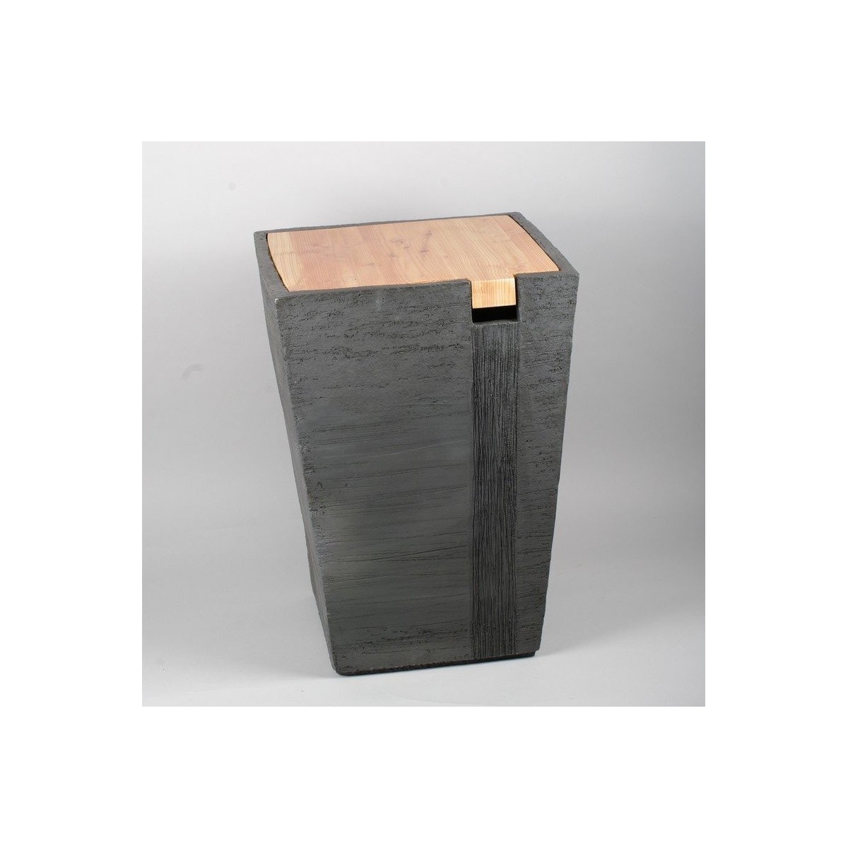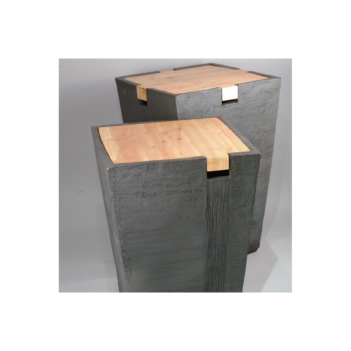 De grès et de bois ces tables basses s’ouvrent pour offrir un espace de rangement. Une étagère amovible à l’intérieur permet de créer deux niveaux de rangement. Un encastrement permet de fixer une assise stable en bois traité sans produit toxique pour l’intérieur ou pour l’extérieur.