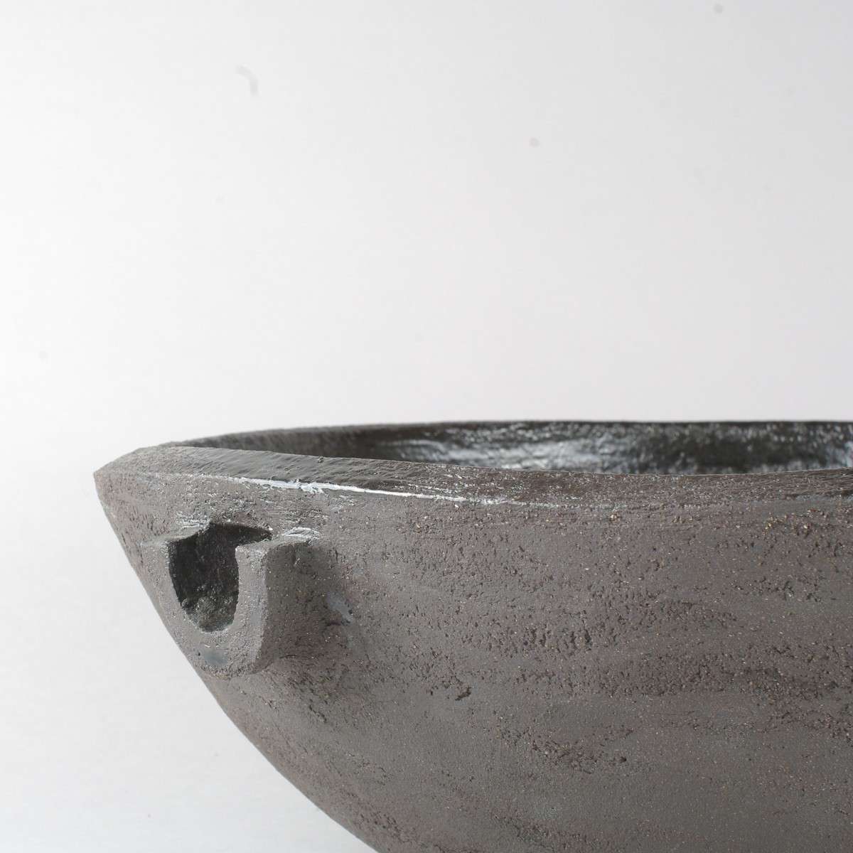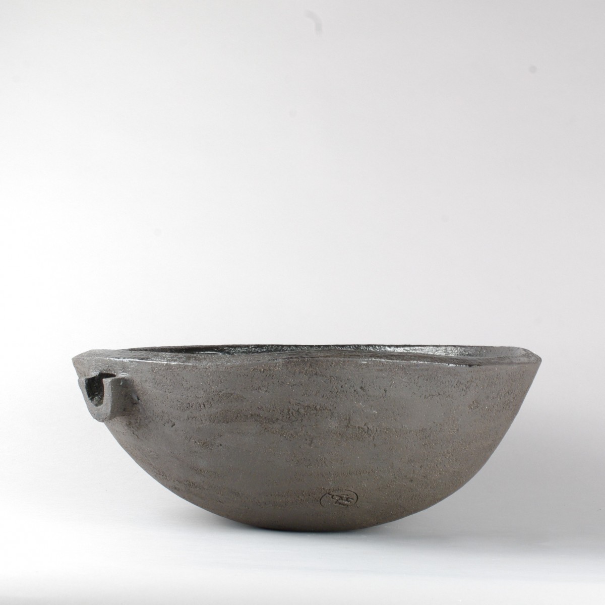 Vasque de jardin avec écoulement en bec, en grès noir brut extérieur et émaillage gris intérieur. diam 40 cm