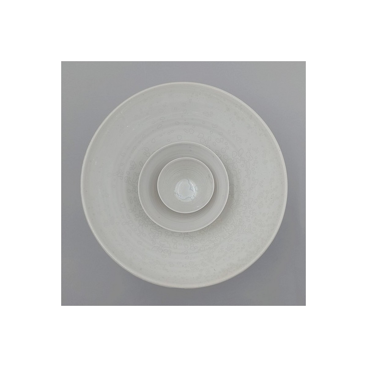 La porcelaine mise en relief après le tournage rivalise de blanc. L’émail nucléé en intérieur des pièces est inspiré des cristaux de glace et flocons de l’hiver. Célébration de l’hiver, de la neige sur les montagnes, saison propice aux rêves divers.